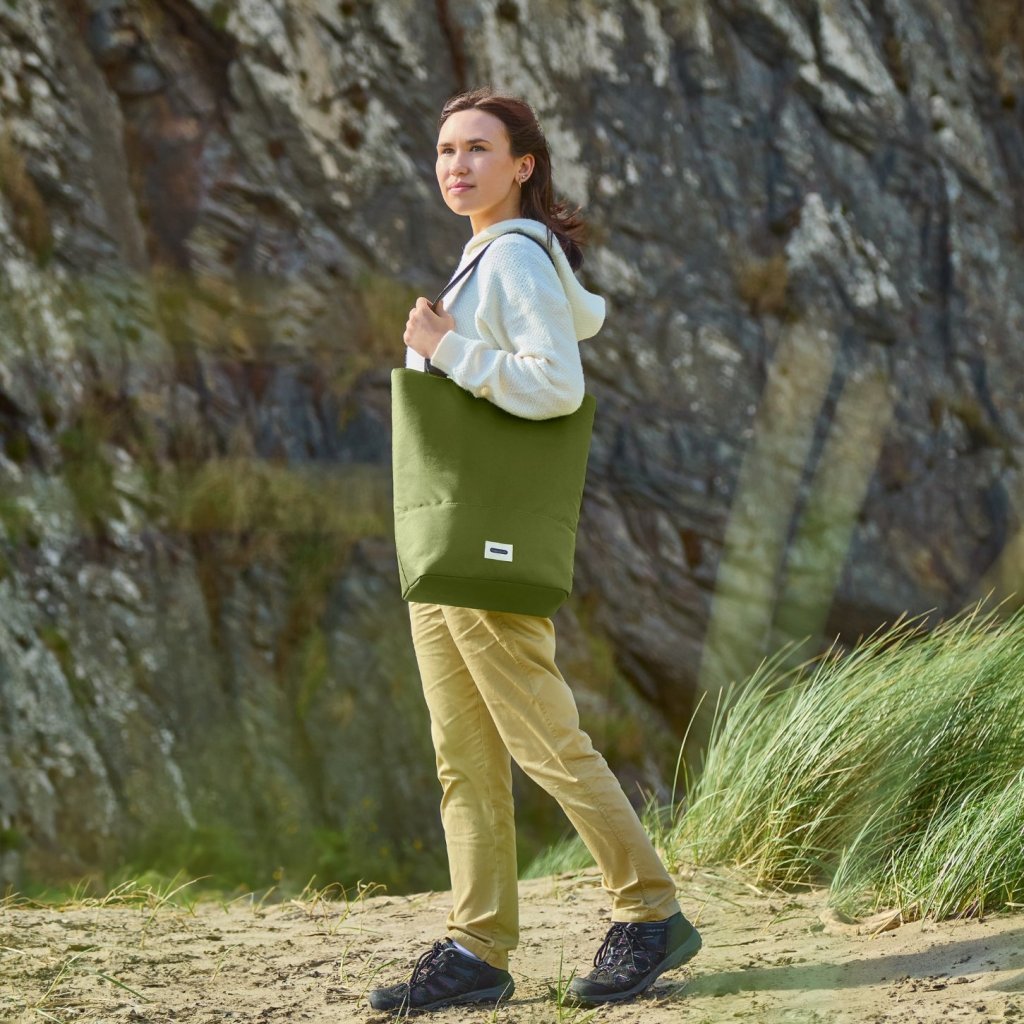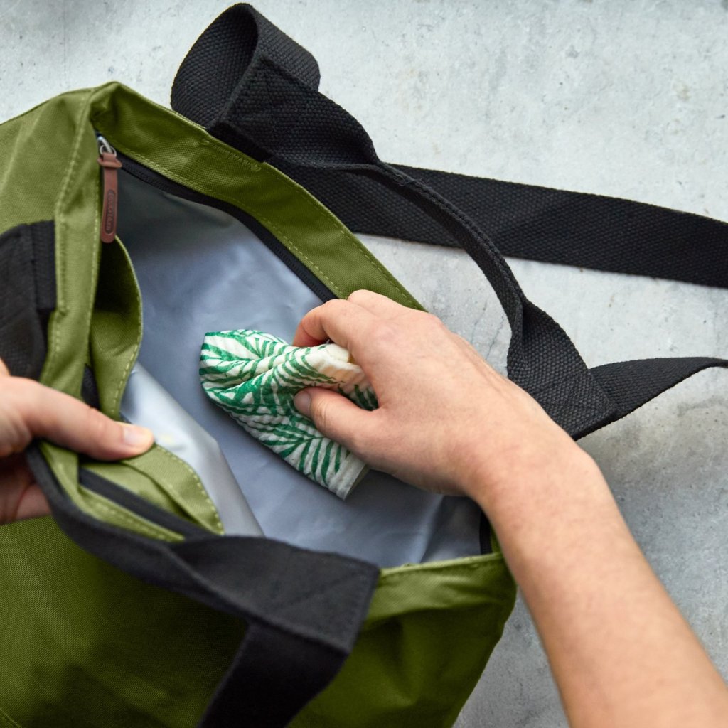 - materiaal: staal (rits), polypropyleen (riem), gerecycled PET polyester (buitenstof), BPA en voedselveilig PEVA (binnenvoering met gelaste naden)