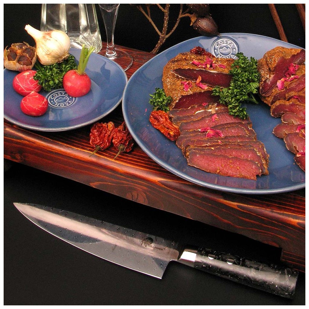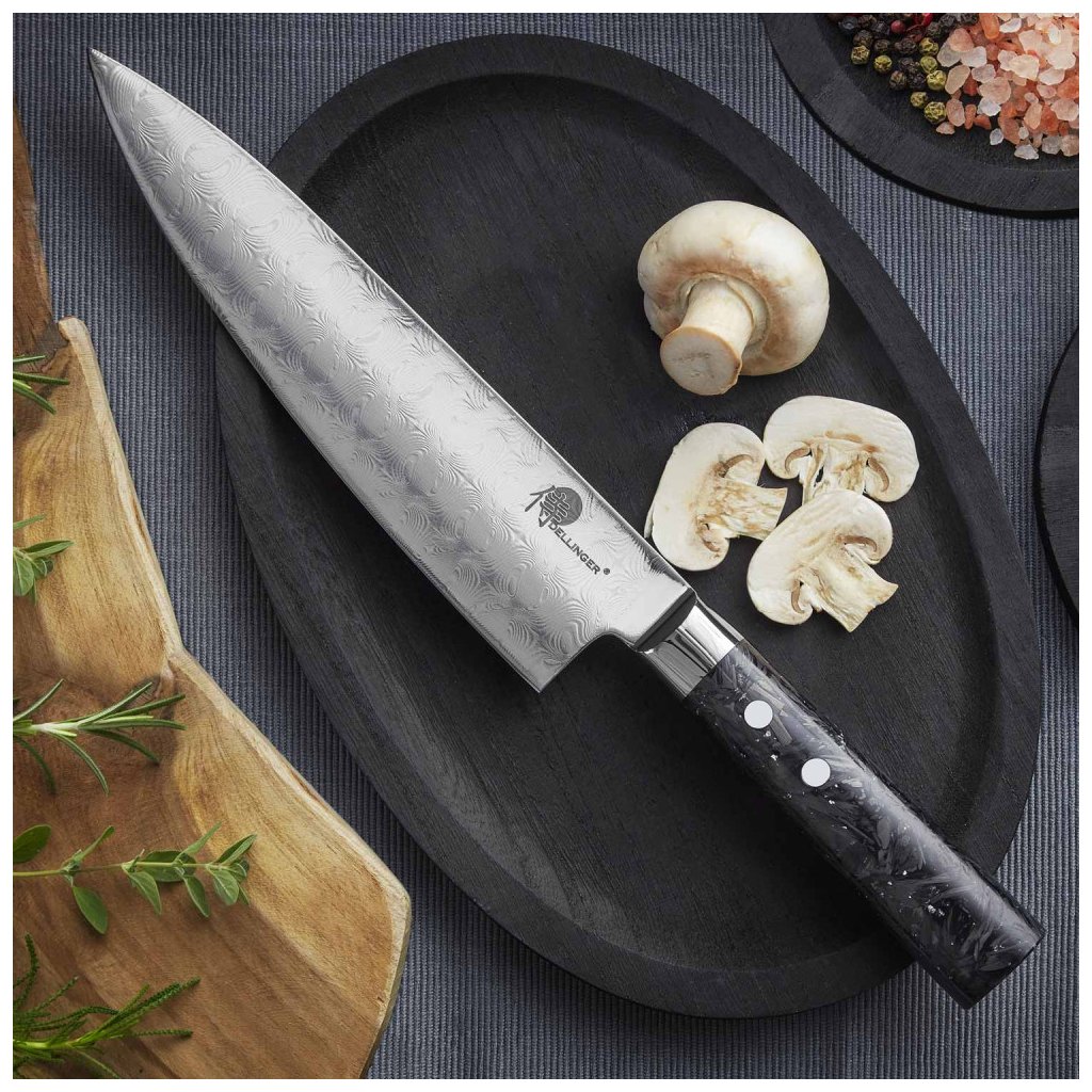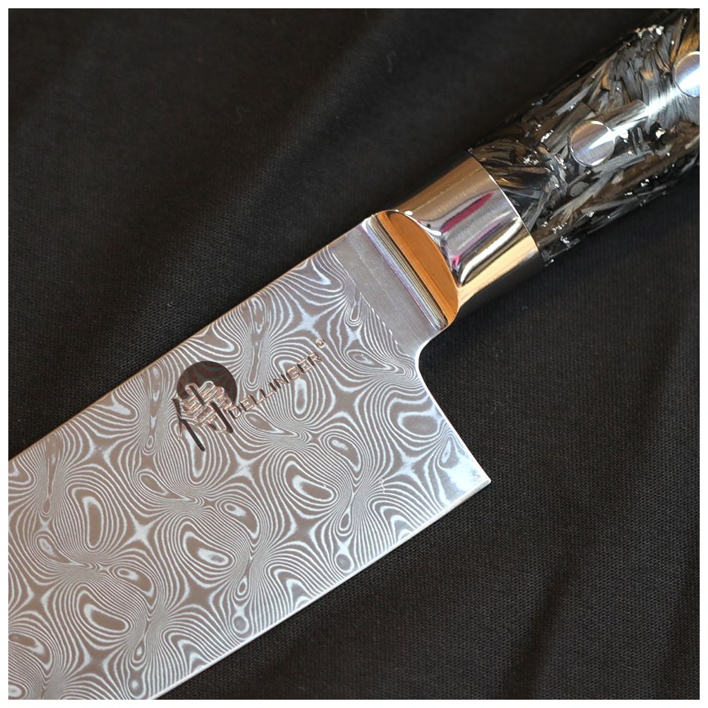 - het zorgvuldig geslepen lemmet zonder kern is gemaakt van 110 lagen van twee harde roestvrije en gesmede staalsoorten en bereikt een hardheid van ongeveer 60 HRC