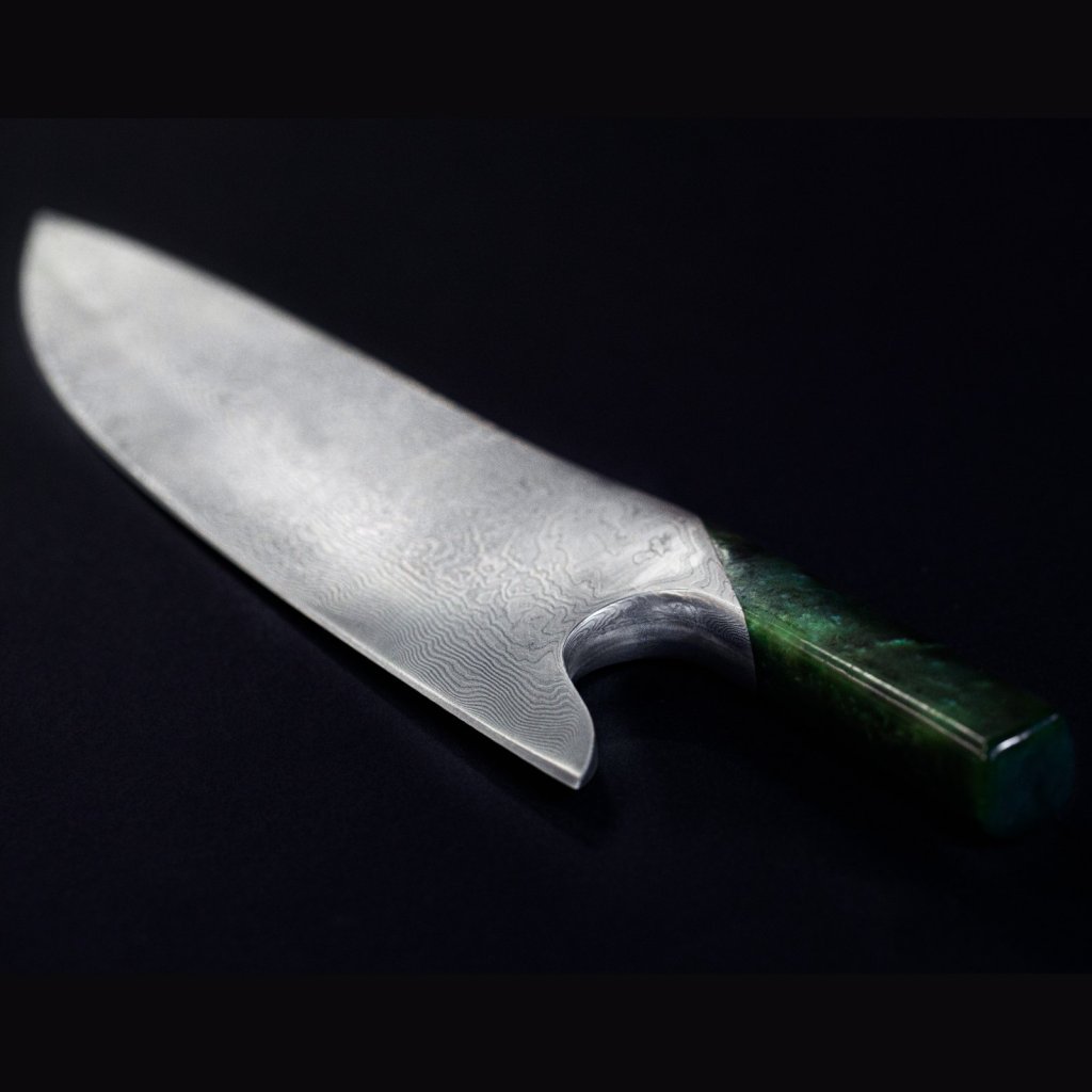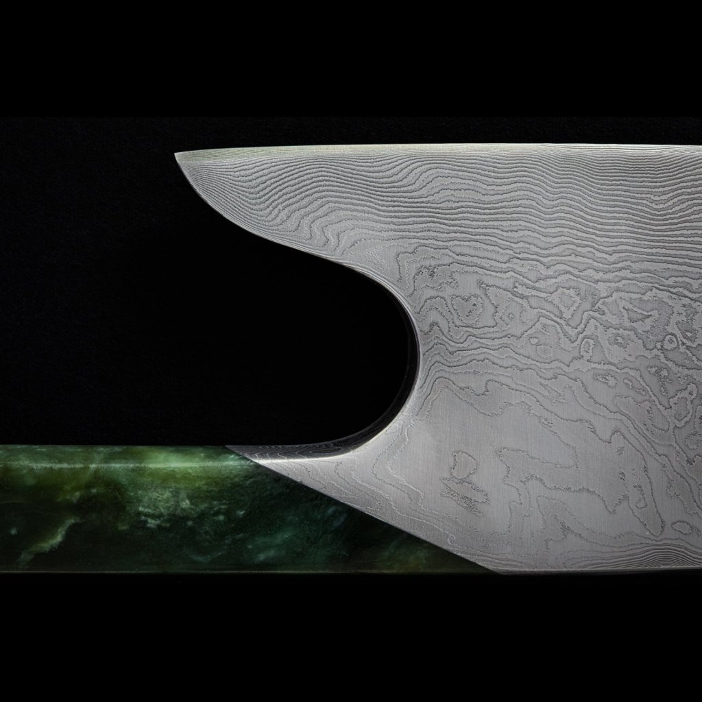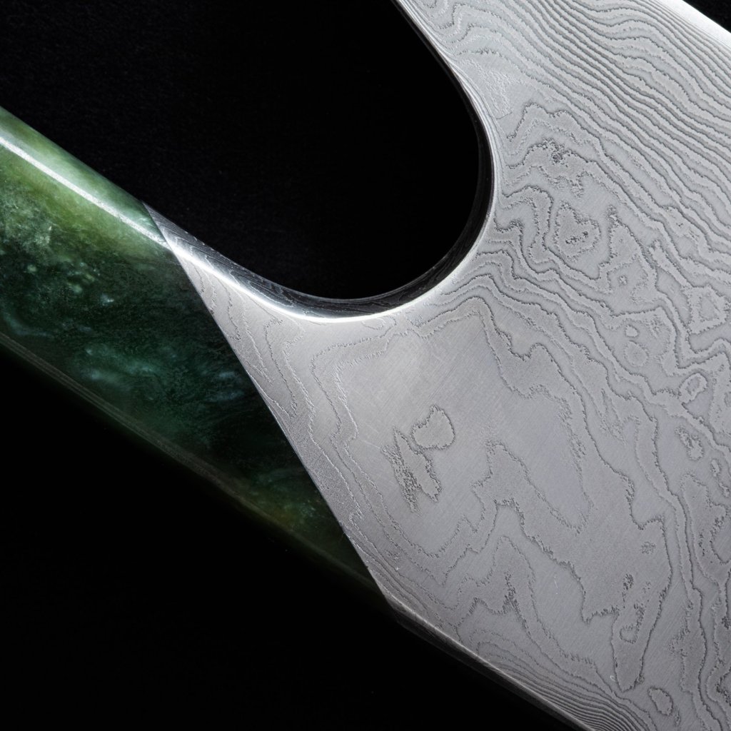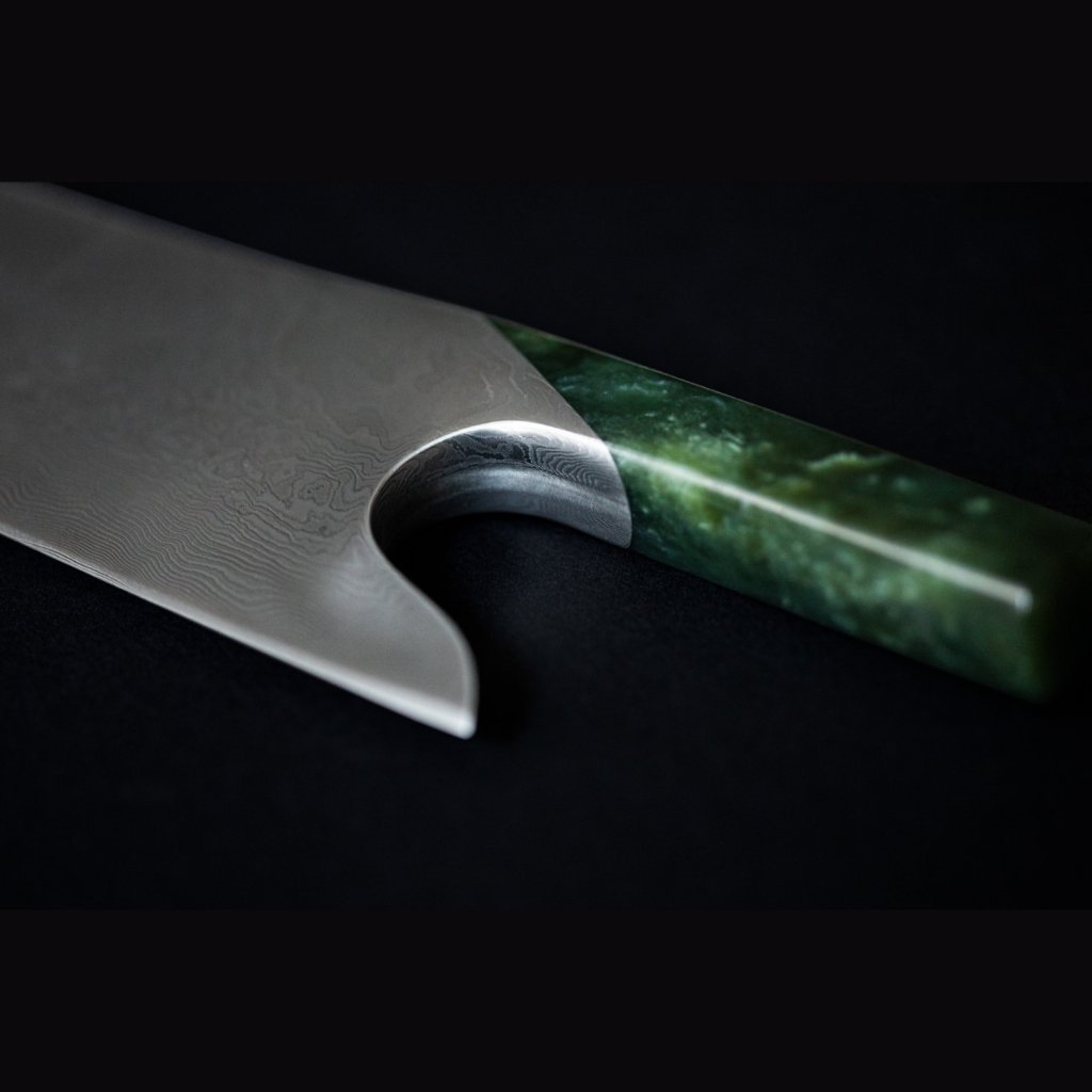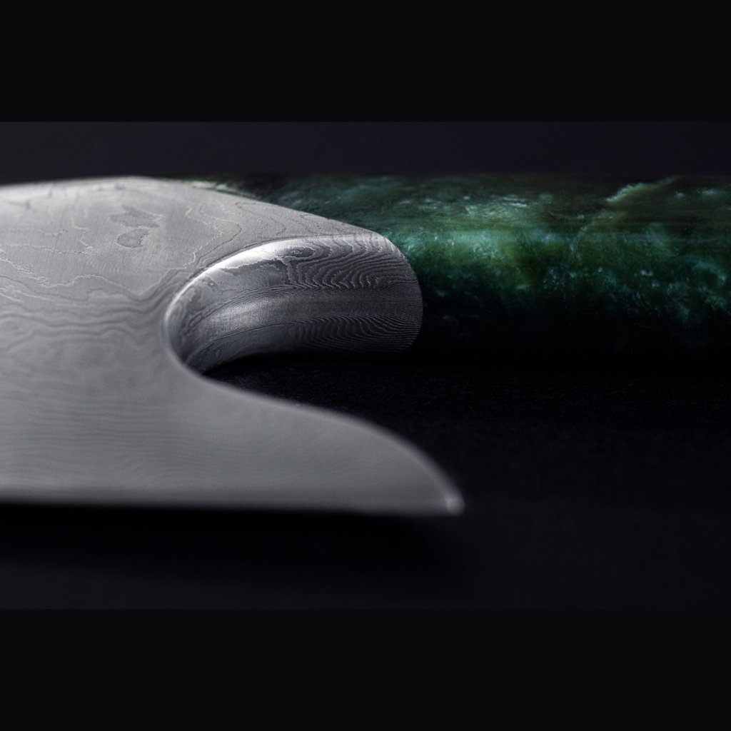 - relatief kort handvat met Nieuw-Zeelandse jade zorgt ervoor dat je het mes meer naar voren kunt houden tot je duim en wijsvinger het lemmet omsluiten