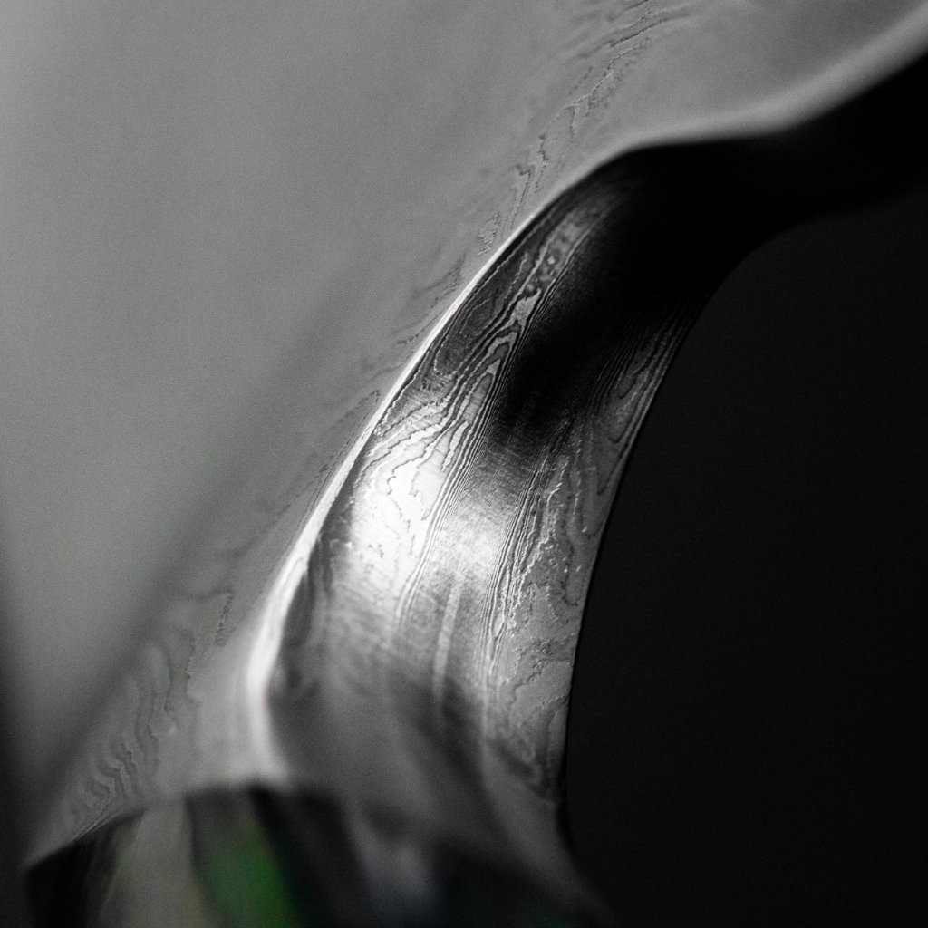 - het mes heeft geen harde kern, zoals gebruikelijk in andere damascusmessen, het is een zogenaamde wilde damascus