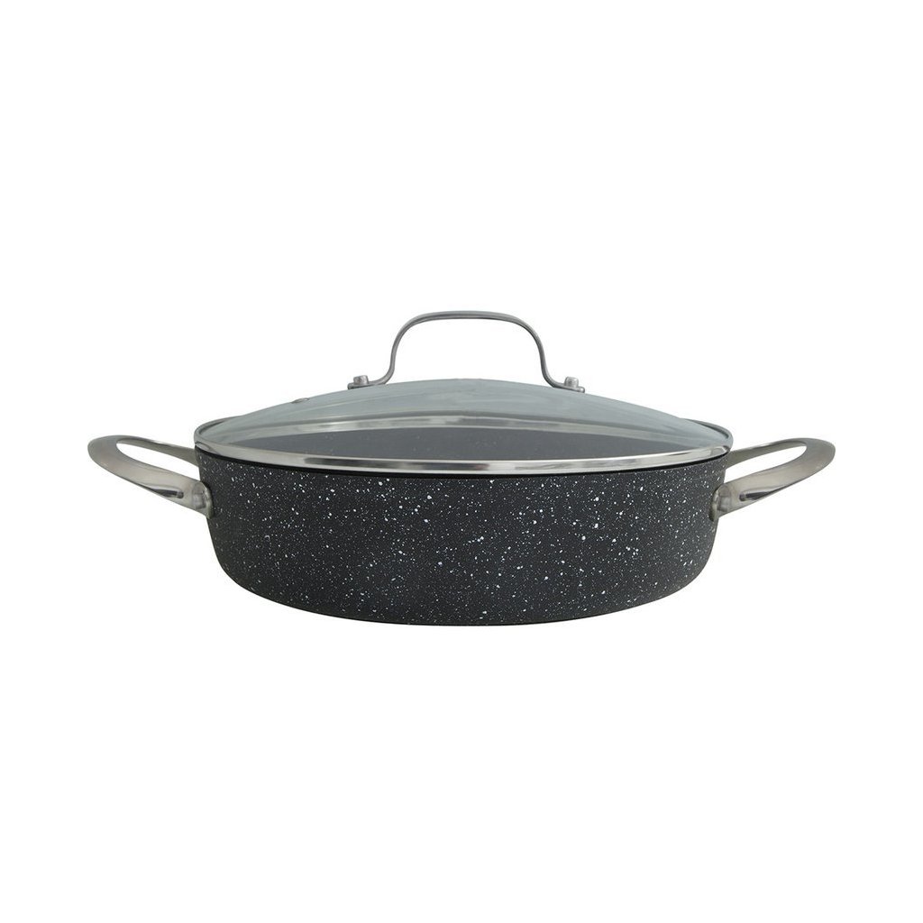 Een lage pan met een antiaanbaklaag die u dagelijks kunt gebruiken bij het bereiden van uw favoriete gerechten. Dit is een pot die in geen enkele keuken mag ontbreken. De stevige handgrepen zorgen ervoor dat het kookgerei gemakkelijk te hanteren is. Hij kan worden gebruikt in een oven tot 260°C (260°F) en is voorzien van een glazen deksel met stoomontluchter.