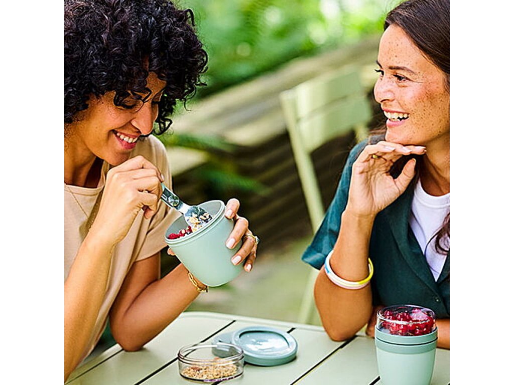- het bovenste transparante bakje van 200 ml is ideaal voor muesli, fruit of knapperige croutons zonder het risico nat te worden