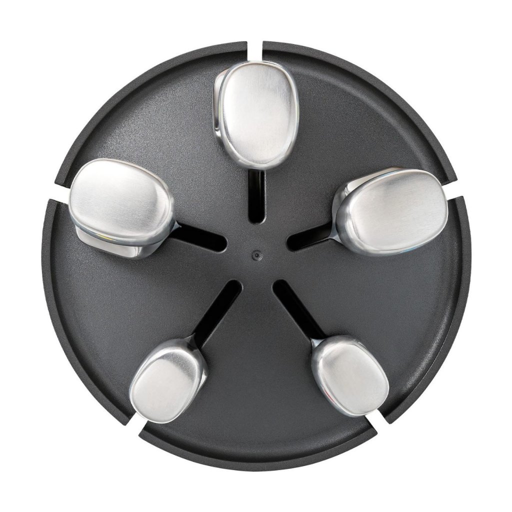 - De draaibare standaard van roestvrij staal biedt gemakkelijke toegang tot alle messen vanuit elke richting, zodat u het blok tijdens het werk niet hoeft op te tillen of over het werkblad te verplaatsen.