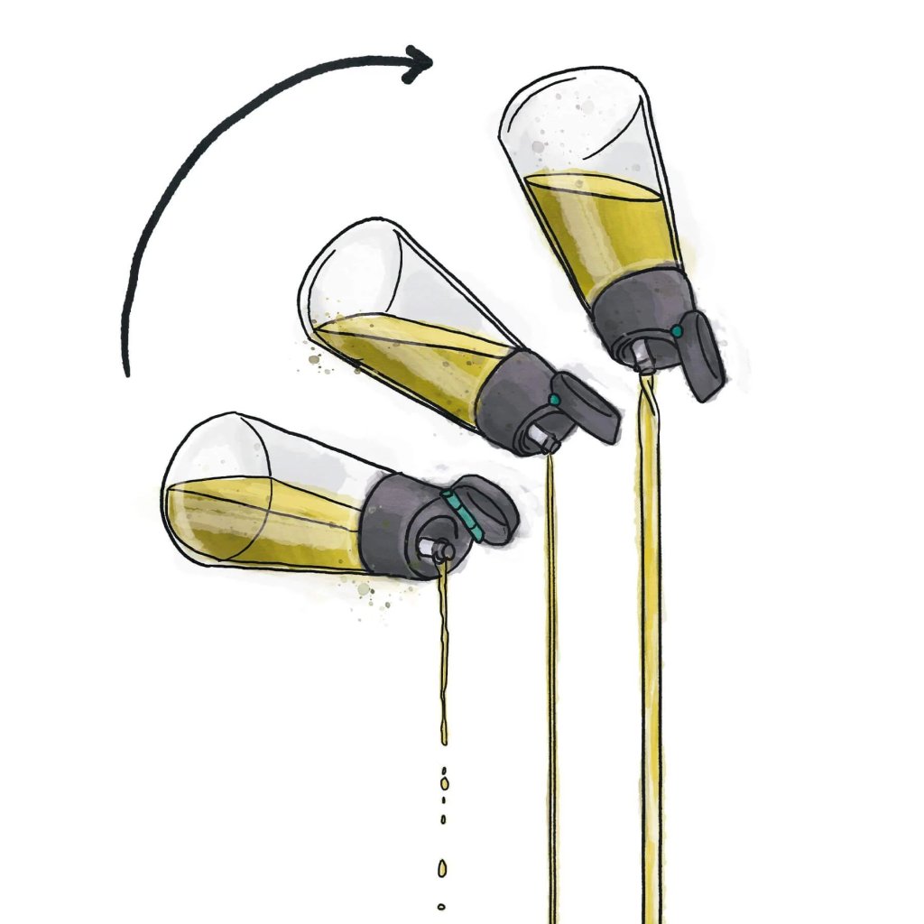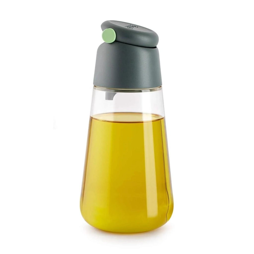 Ken je dat moment dat je je salade lichtjes wilt besprenkelen en je eindigt met een plas olie waarmee je een pier zou kunnen bouwen? Met deze doseerfles heb je zowel de rem als de gashendel in de hand, zodat je één keer over de bladeren kunt strijken en de pan de tweede keer zonder zenuwen kunt hanteren.