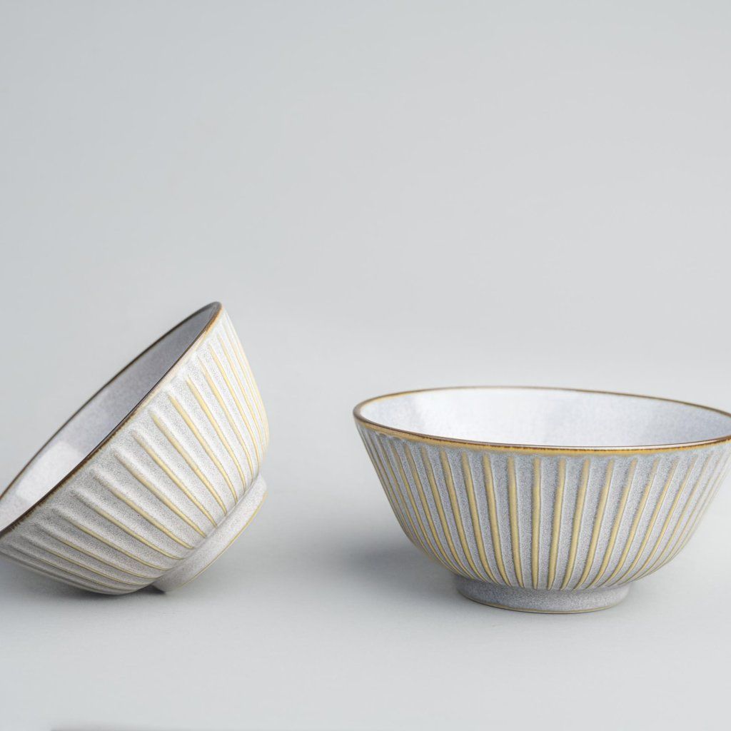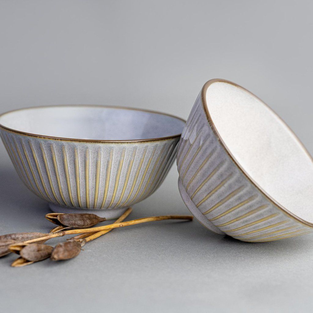 - Het typische sendan-patroon met fijne verticale lijnen creëert een plastisch effect dat de kom diepte geeft en tegelijkertijd het minimalistische karakter behoudt.