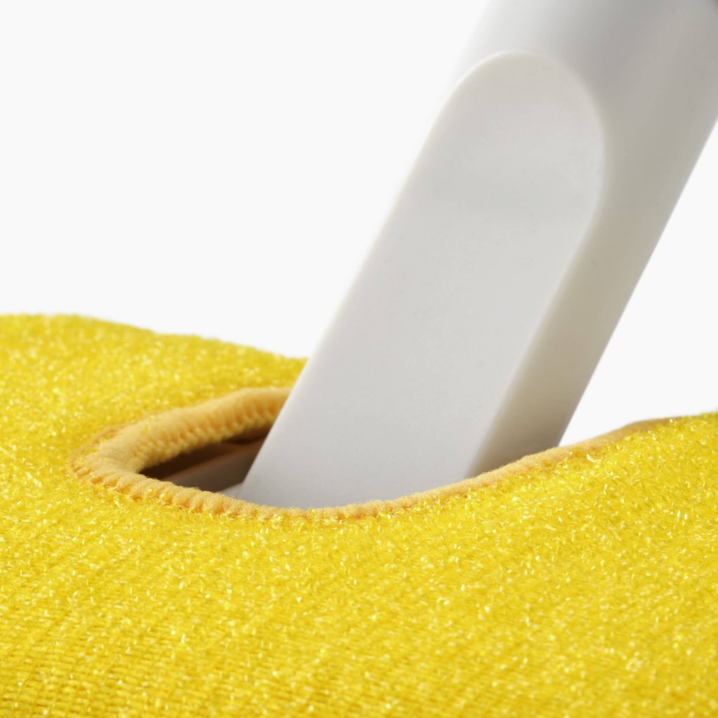 - De zachte microvezelzijde neemt vuil en stof voorzichtig op zonder gevoelige oppervlakken zoals glas, glanzende tegels, badkuipen of douchecabines te beschadigen.