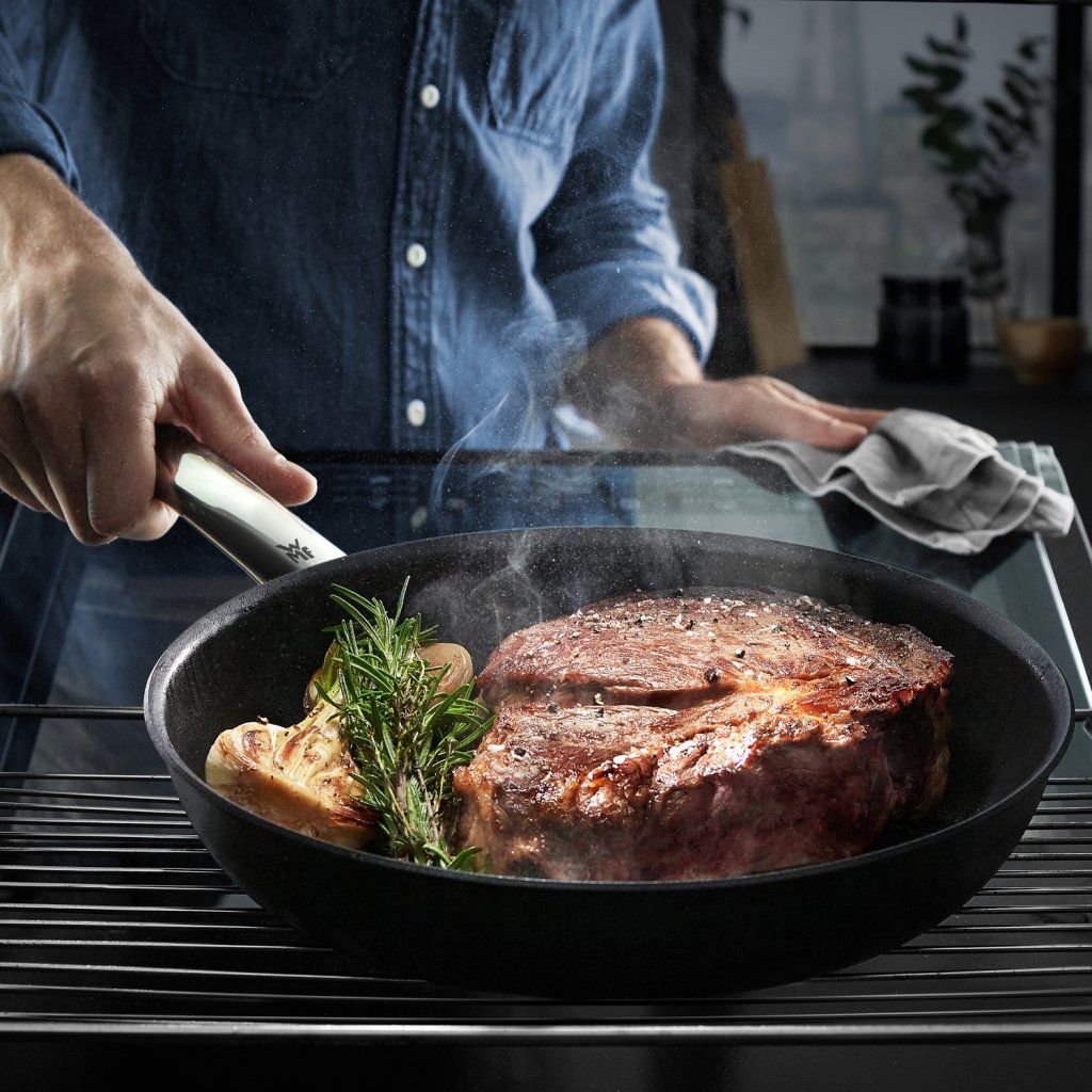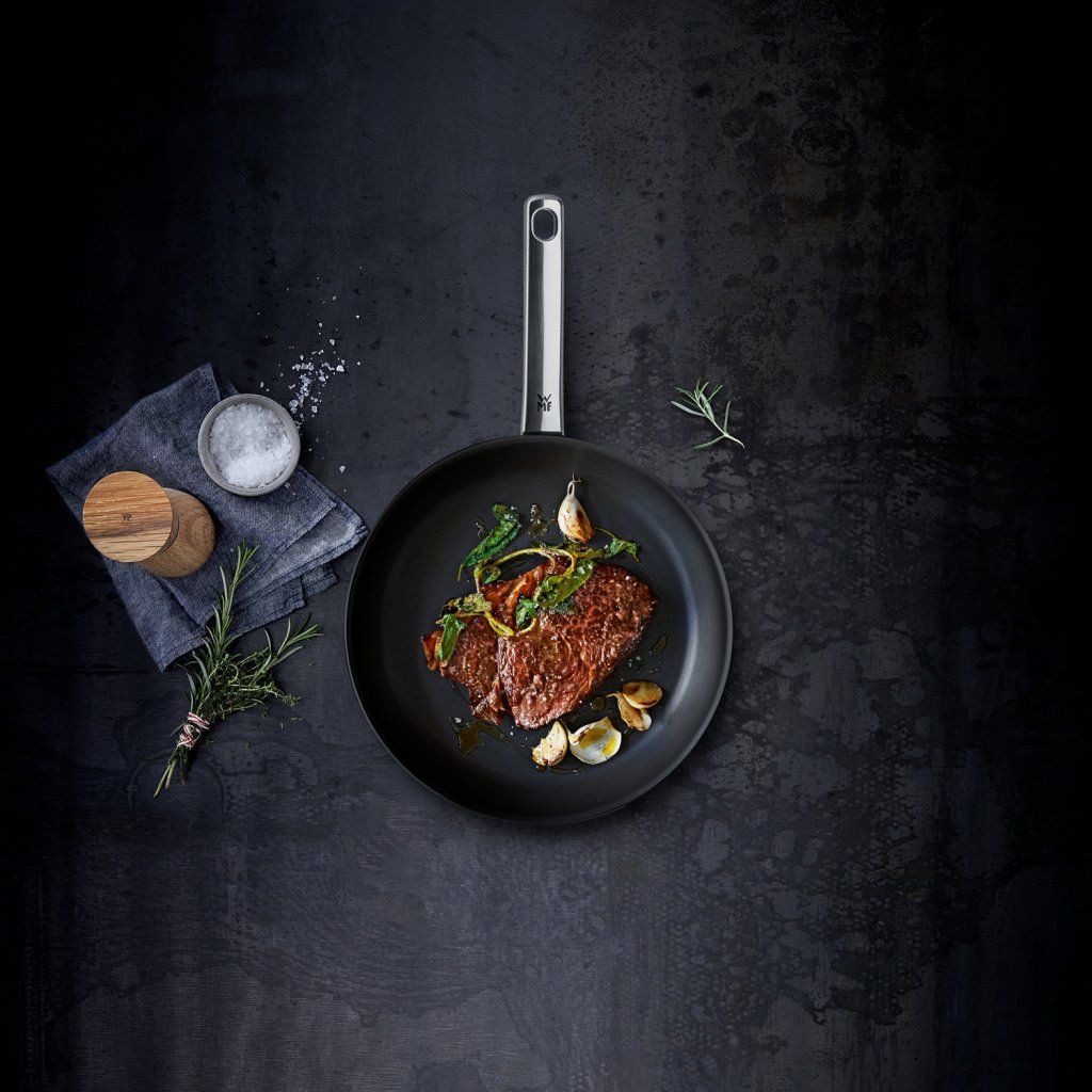Robuuste Snelle Professionele koekenpan van het Duitse merk WMF is gemaakt van gelaagd materiaal met een gepatenteerde antiaanbaklaag. Dit oppervlak heeft uitstekende antikleefeigenschappen en een lange levensduur, en is PFOA-vrij. De pan zal een breed scala aan toepassingen in uw keuken vinden, aangezien hij geschikt is voor elk soort voedsel.