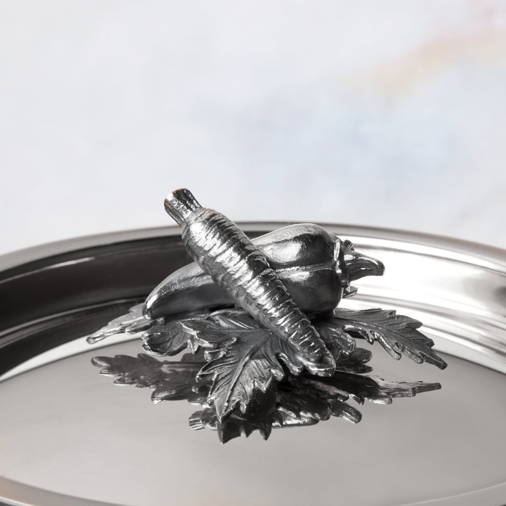 - massief roestvrijstalen deksel met een handvat in een prachtig decor, dat met de hand is gegoten in massief brons en verzilverd
