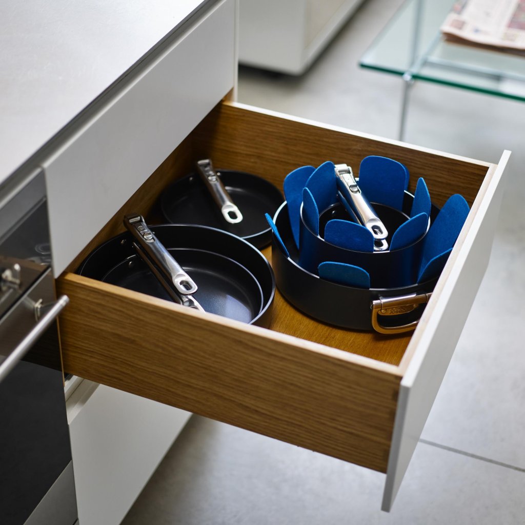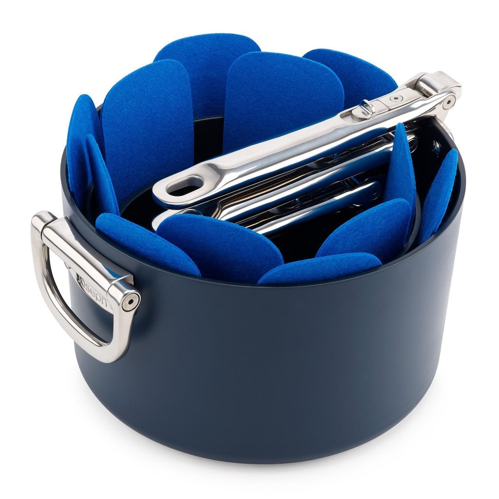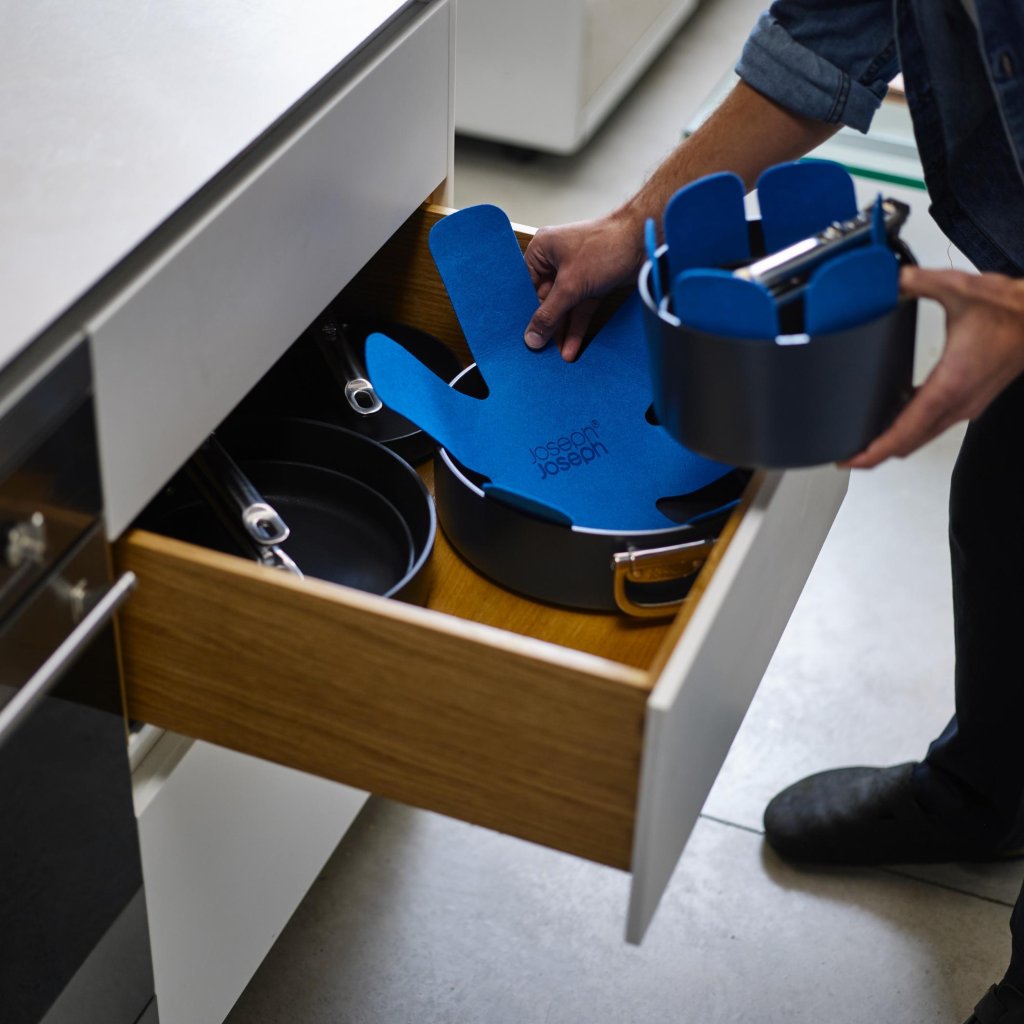 - De Joseph Joseph SPACE set van beschermende inzetstukken beschermt de oppervlakken van het kookgerei tijdens het stapelen en bevordert een overzichtelijke, veilige opslag in lades en kasten.