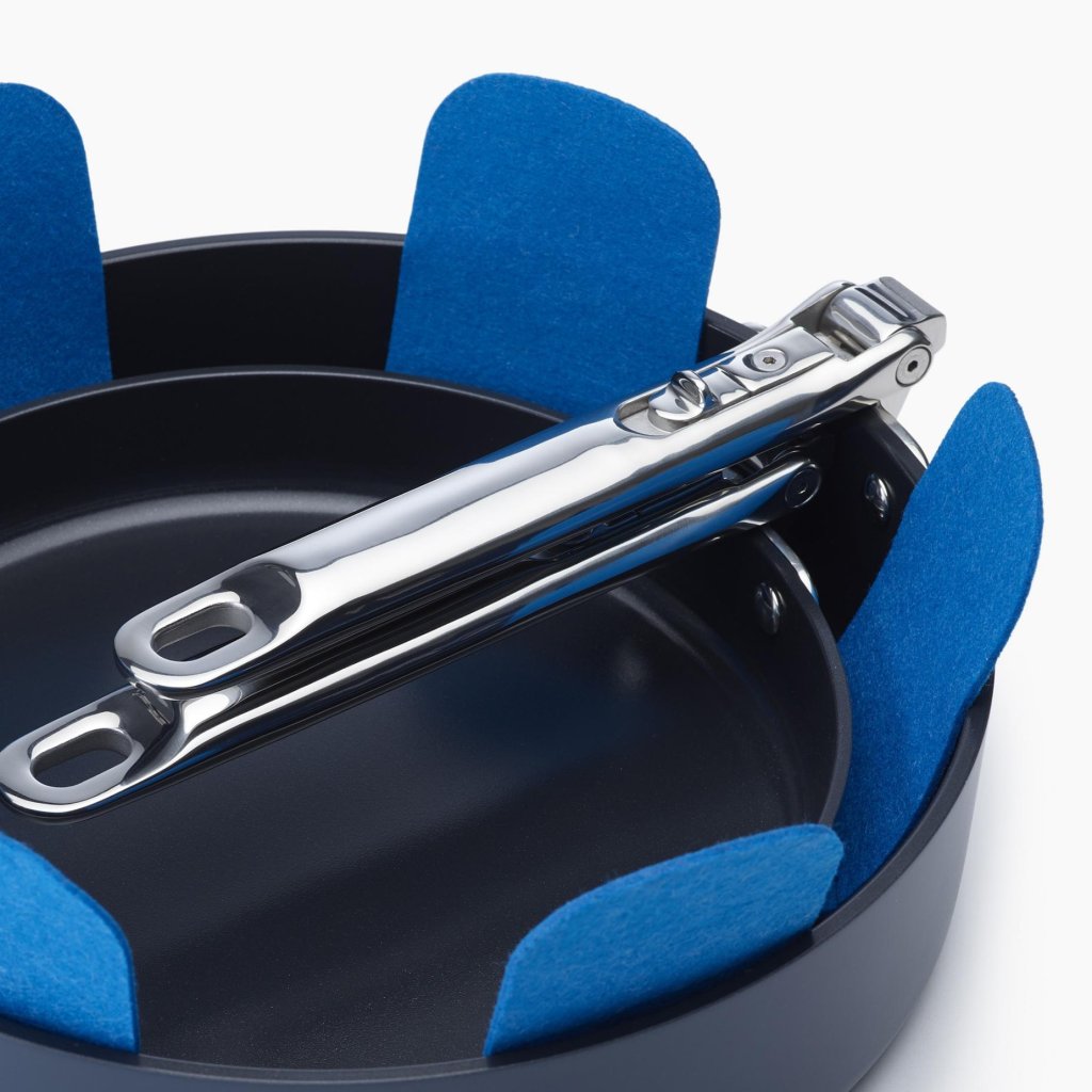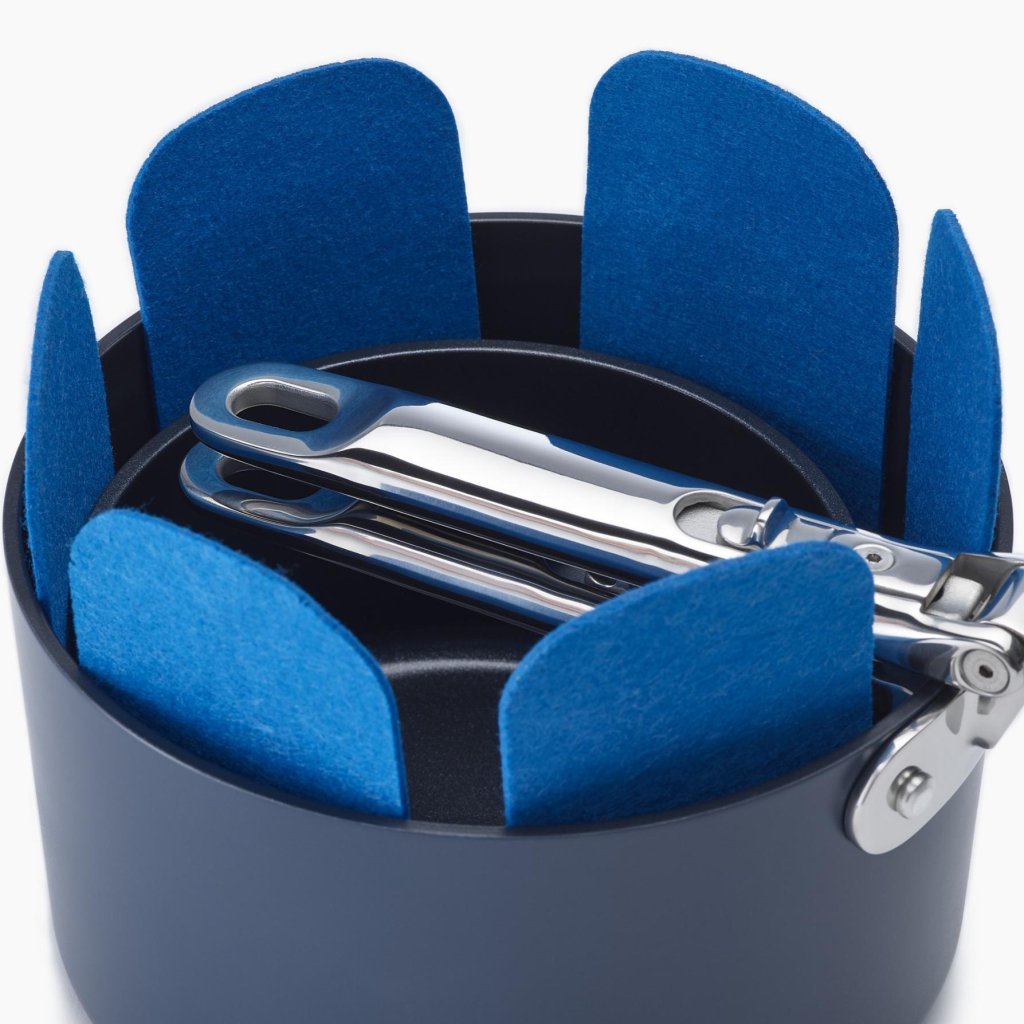 - De zachte maar stevige materiaalstructuur creëert een beschermende laag tussen de afzonderlijke pannen en potten die in elkaar zijn opgeborgen.