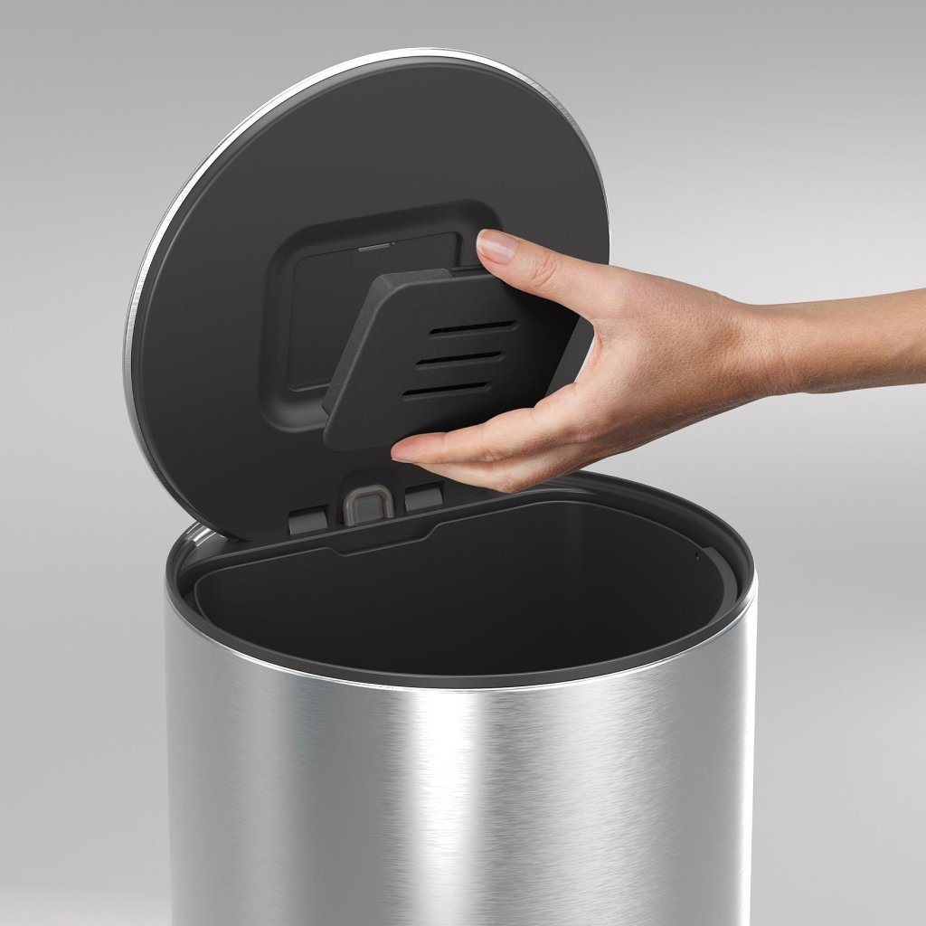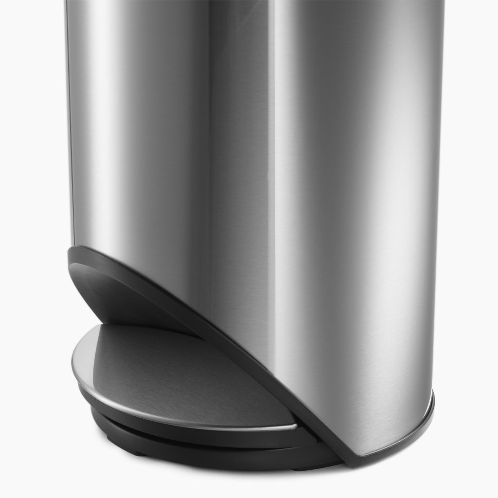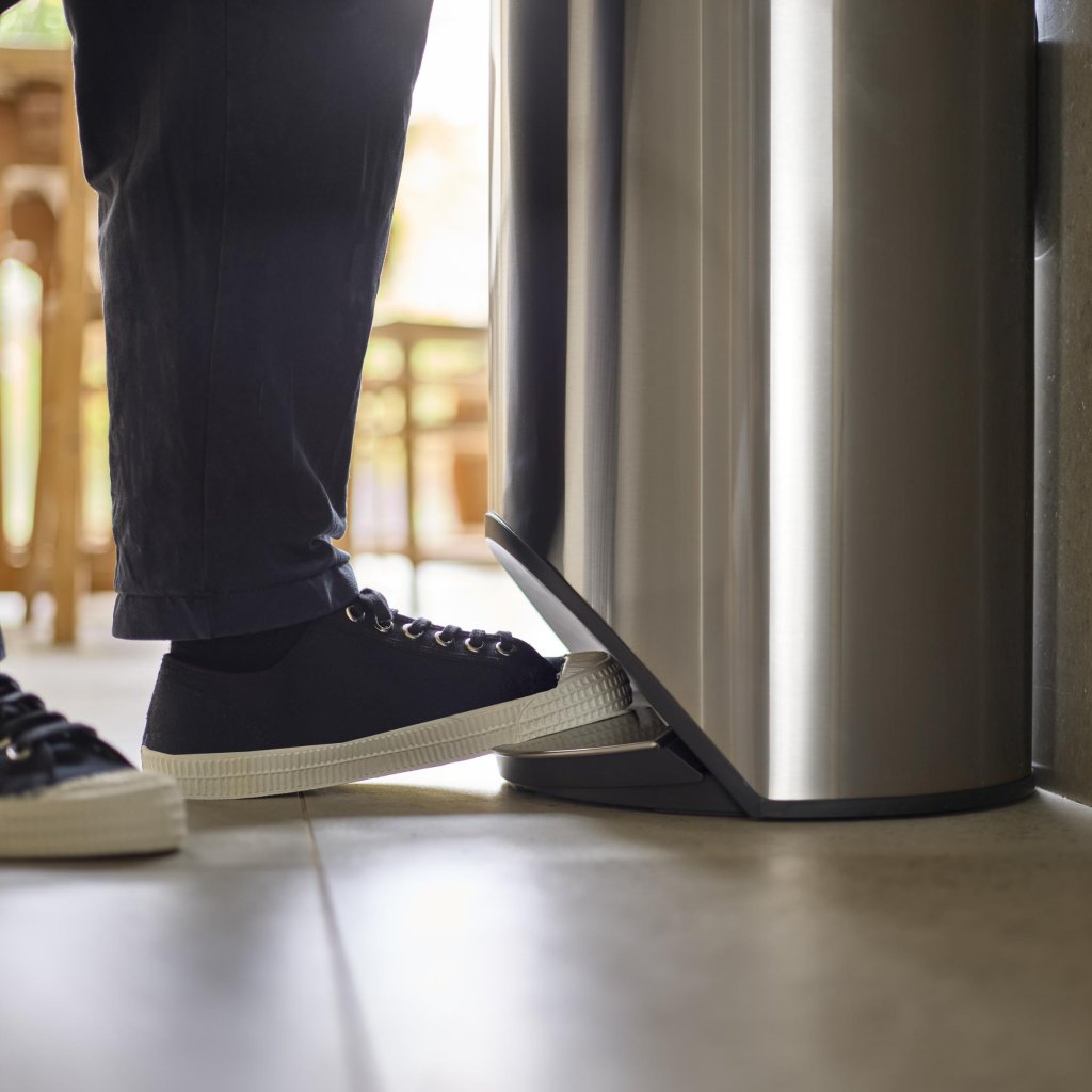- Het doordachte ronde ontwerp zorgt ervoor dat het pedaal verborgen blijft binnen de omtrek van de prullenbak en geen extra vloeroppervlak inneemt.
