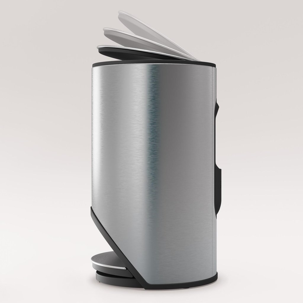 Sommige prullenbakken proberen onopvallend te zijn. Deze is zo zelfverzekerd onopvallend dat je het meteen opvalt. De roestvrijstalen cilinder met een subtiel gebogen lijn lijkt bijna op een designobject dat toevallig besloot uw dagelijkse afval aan te pakken.