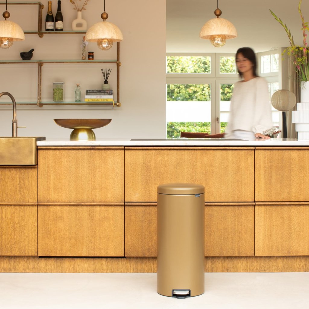 - pedaalemmer Brabantia NEWICON in een warme messing tint is een praktische en elegante oplossing voor dagelijkse afvalinzameling