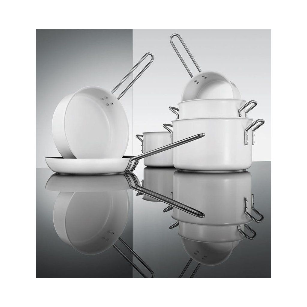 White Line kookgerei is gemaakt van een hoogwaardige aluminiumlegering, die de warmte perfect geleidt. Potten en pannen zijn dus geschikt voor koken en bakken. Het keramische oppervlak met antiaanbaklaag is hard en robuust en behoudt zijn witte kleur, ongeacht of u een elektrische, gas- of inductiekookplaat gebruikt. Bovendien is het zeer gemakkelijk schoon te maken. Om tijd en energie te besparen kan de vaat in de vaatwasser.