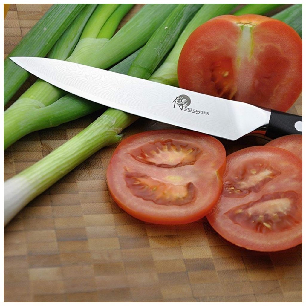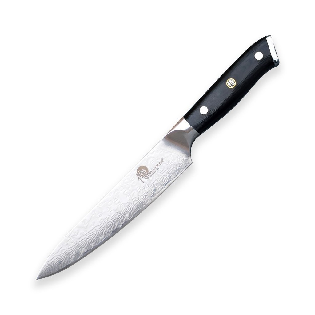 Zeer scherp Japans groente- en fruitmes Utility 5" Dellinger Samurai (lemmetlengte 130 mm) van damascusstaal met indrukwekkend design en hoogste kwaliteit. Dit damascusmes is een handig alternatief voor een groot koksmes wanneer u nauwkeurig moet snijden, of bijvoorbeeld sperziebonen of andere kleinere groenten en fruit moet snijden. Ze zijn ook geschikt voor het spiezen en snijden van vlees.