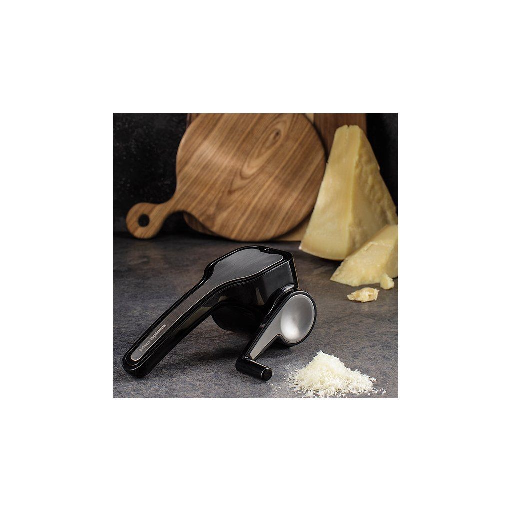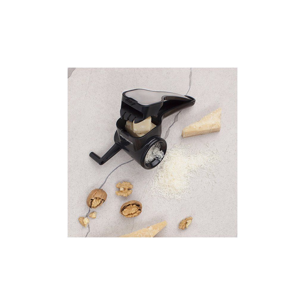 Open de bovenklep. Doe de gewenste ingrediënten in de royale bak: stukjes kaas, chocoladeblokjes of uw favoriete noten. Sluit het deksel weer. De draaiende trommel met scherpe tanden zet de ingrediënten om in fijne spaanders door middel van de draaiende bewegingen van de handgreep en de gelijktijdige lichte druk van de deksel. Met een simpele draai aan de hendel rasp je heerlijke kazen of kaasmengsels direct op pasta, pizza of salades en versier je diverse desserts met chocoladeschaafsel en pistache- of hazelnootschilfers.