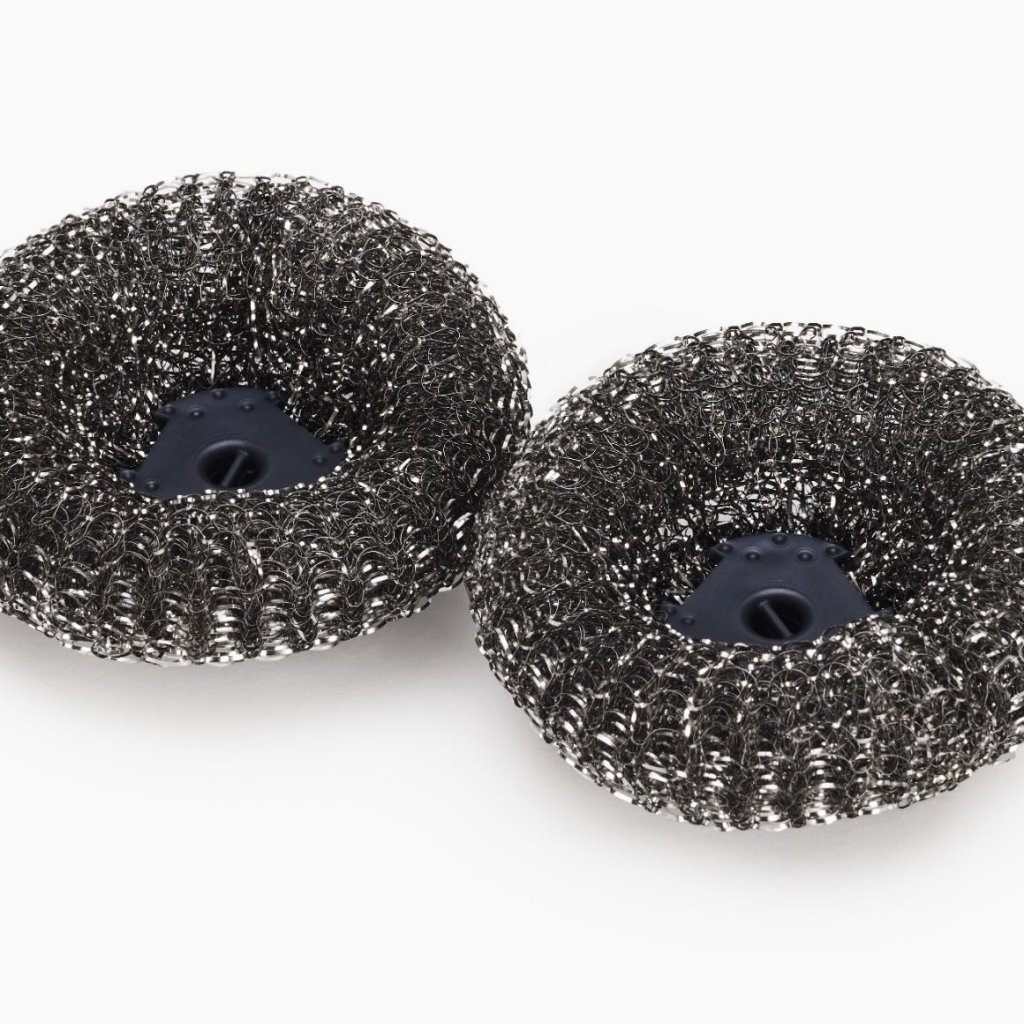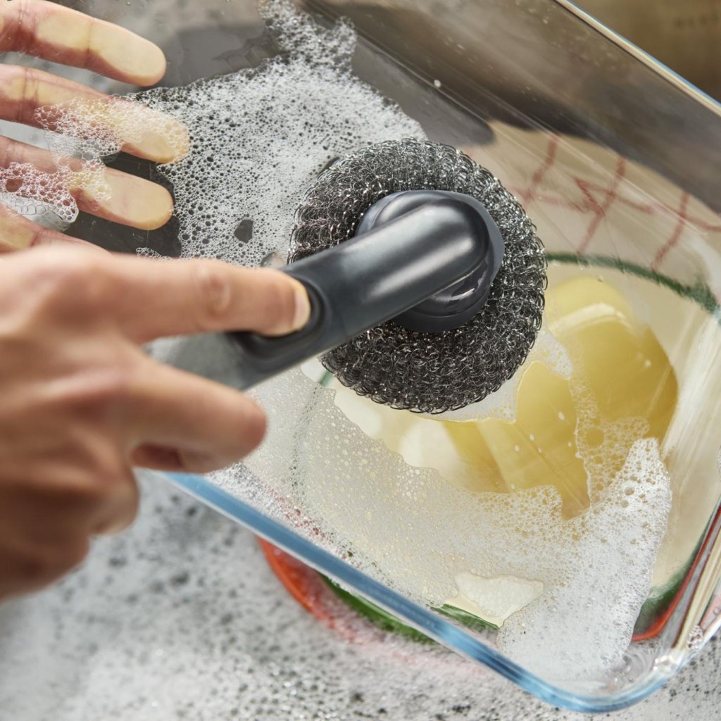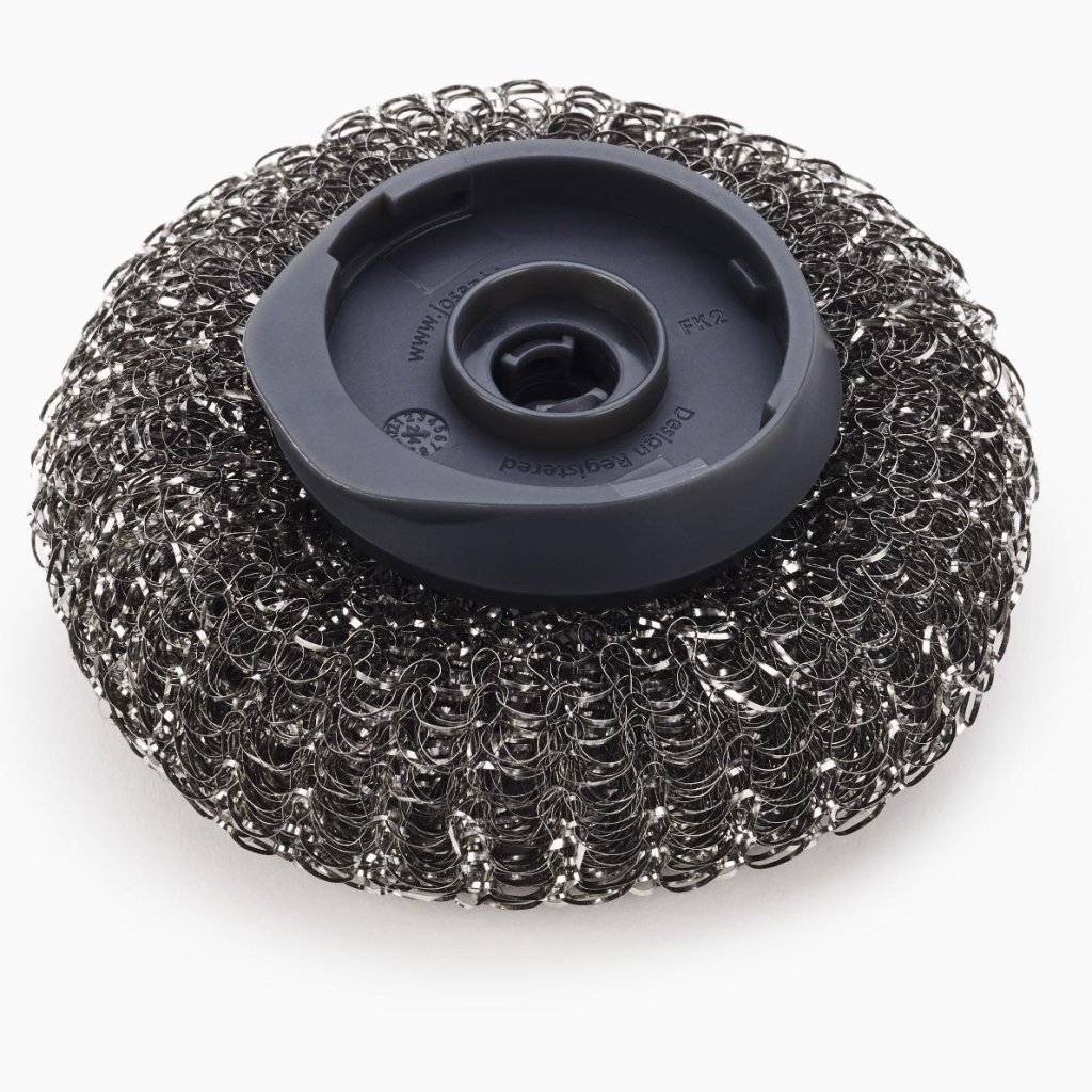 - De draadstructuur helpt bij het eenvoudig verwijderen van aangekoekte vuilresten van potten, pannen of ovenschalen.