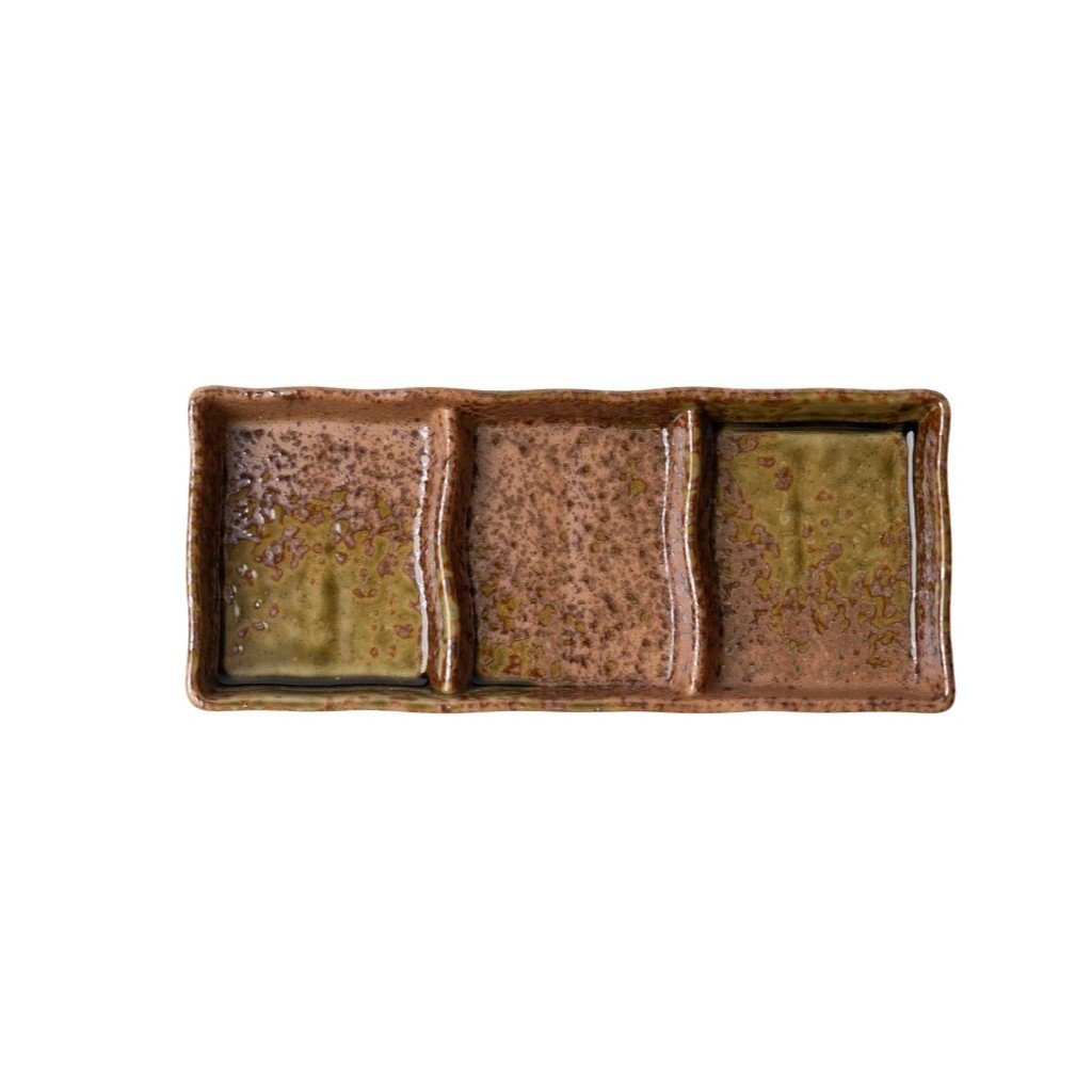 - De WABI SABI rechthoekige sauspan met drie aparte secties biedt overzichtelijk en stijlvol serveren van meerdere smaken in één compacte eenheid.