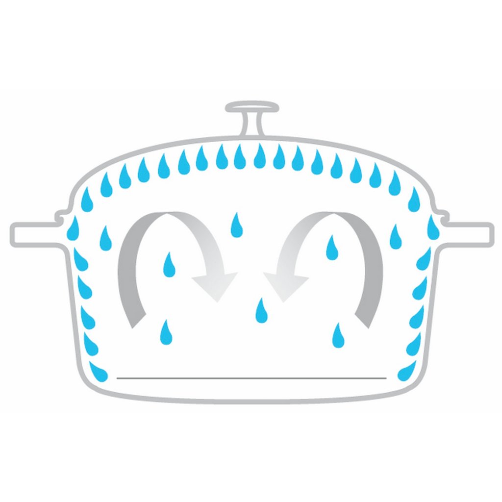De speciale structuur aan de onderkant van het deksel vangt verdampt water op en versnelt dankzij de perfecte vorm de circulatie ervan in de pot. Als er een voldoende grote druppel wordt gevormd, gaat deze terug in de pot. De vorm van de dekselstructuur is geĂŻnspireerd op de vorm van het rieten racket chistera uit het Baskische spel Pelota, waarmee de bal wordt gevangen en gegooid. Dankzij een soortgelijk principe kunt u met het deksel de kookresultaten optimaliseren door het verdampte water terug te voeren in het kookproces.