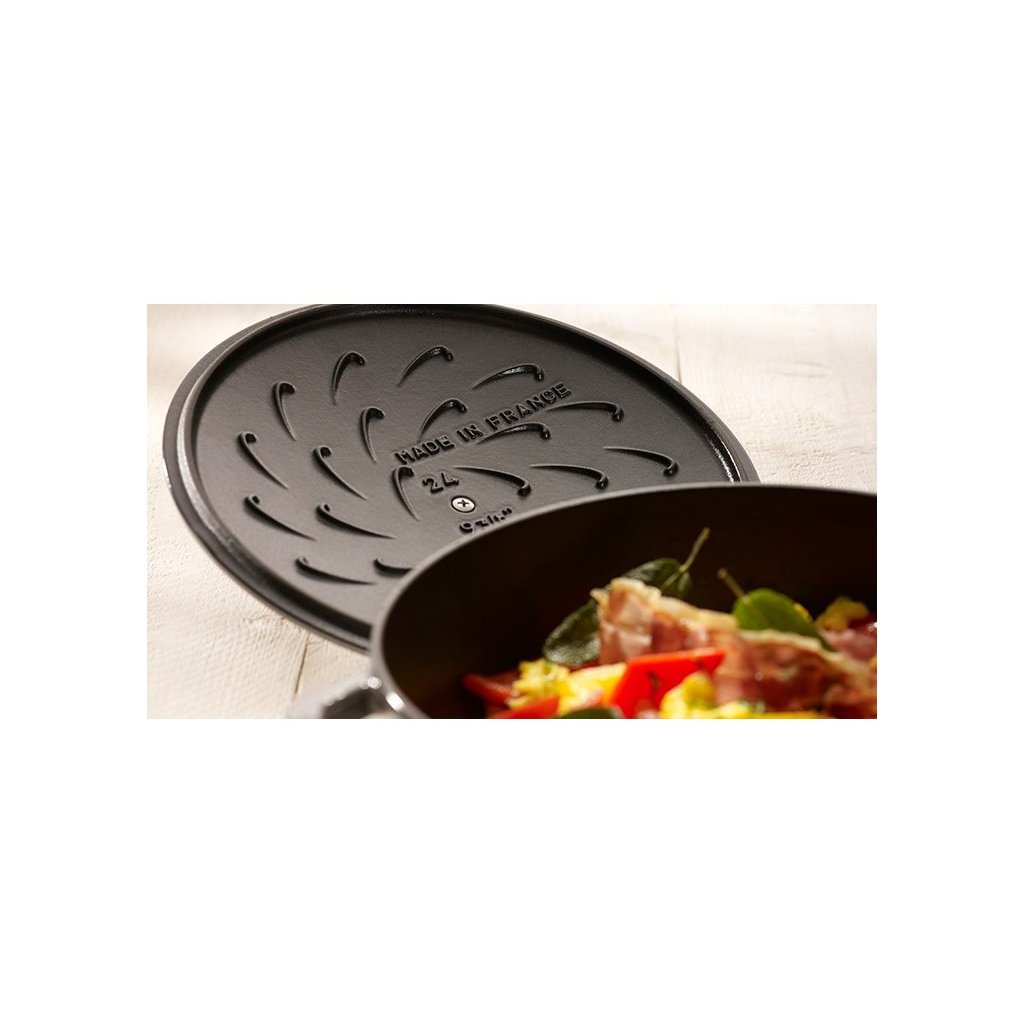 De Chister sauteerpan met gietijzeren "self-basting" deksel zorgt ervoor dat alles wat u erin kookt heerlijk en delicaat is. de "Chistera Drop-Structure" aan de onderkant van het deksel bevordert de continue circulatie van het water in de pan, waardoor ideale omstandigheden ontstaan voor langzaam koken en smoren. Koken in Staub kookgerei is zeer gemakkelijk, niet alleen dankzij de beproefde vorm van het kookgerei, maar ook dankzij het gebruikte materiaal.