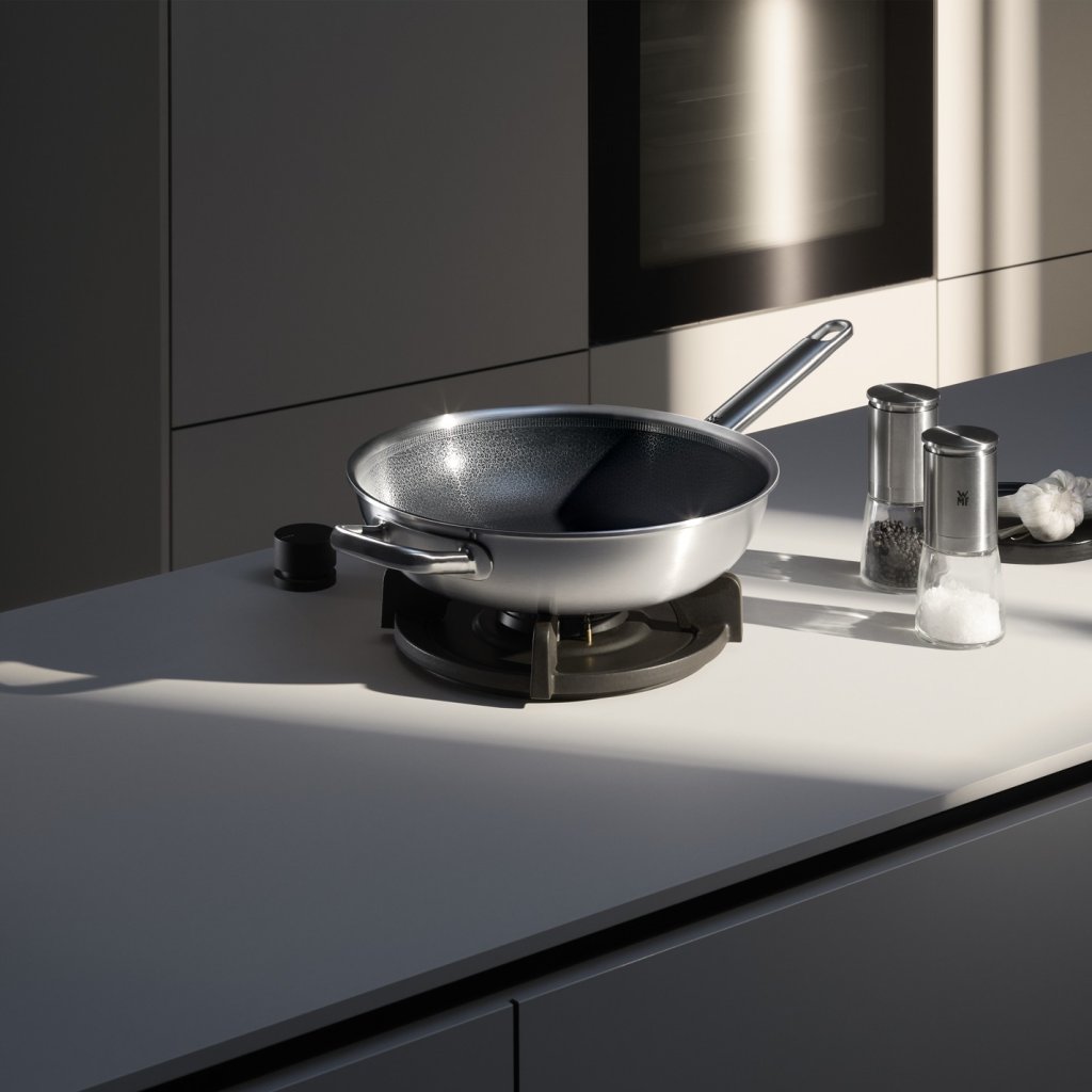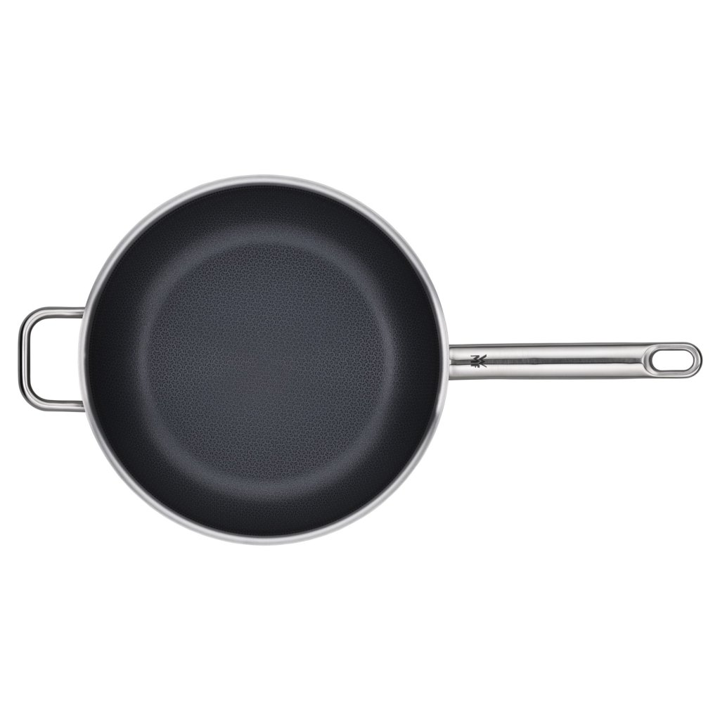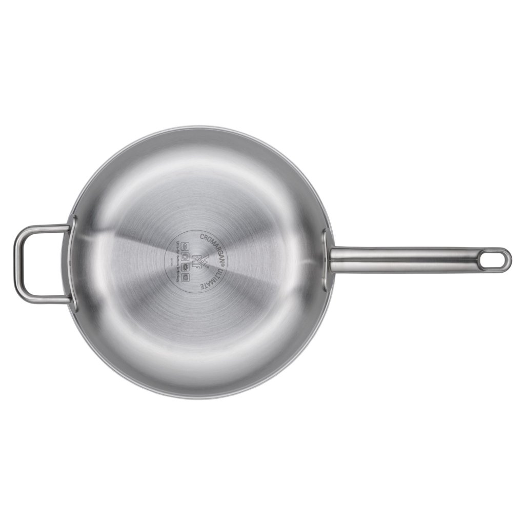 - De gepatenteerde bodem is 80% vlakker dan pannen WMF PROFI, wat bijdraagt aan een gelijkmatige verdeling van warmte en olie tijdens het koken