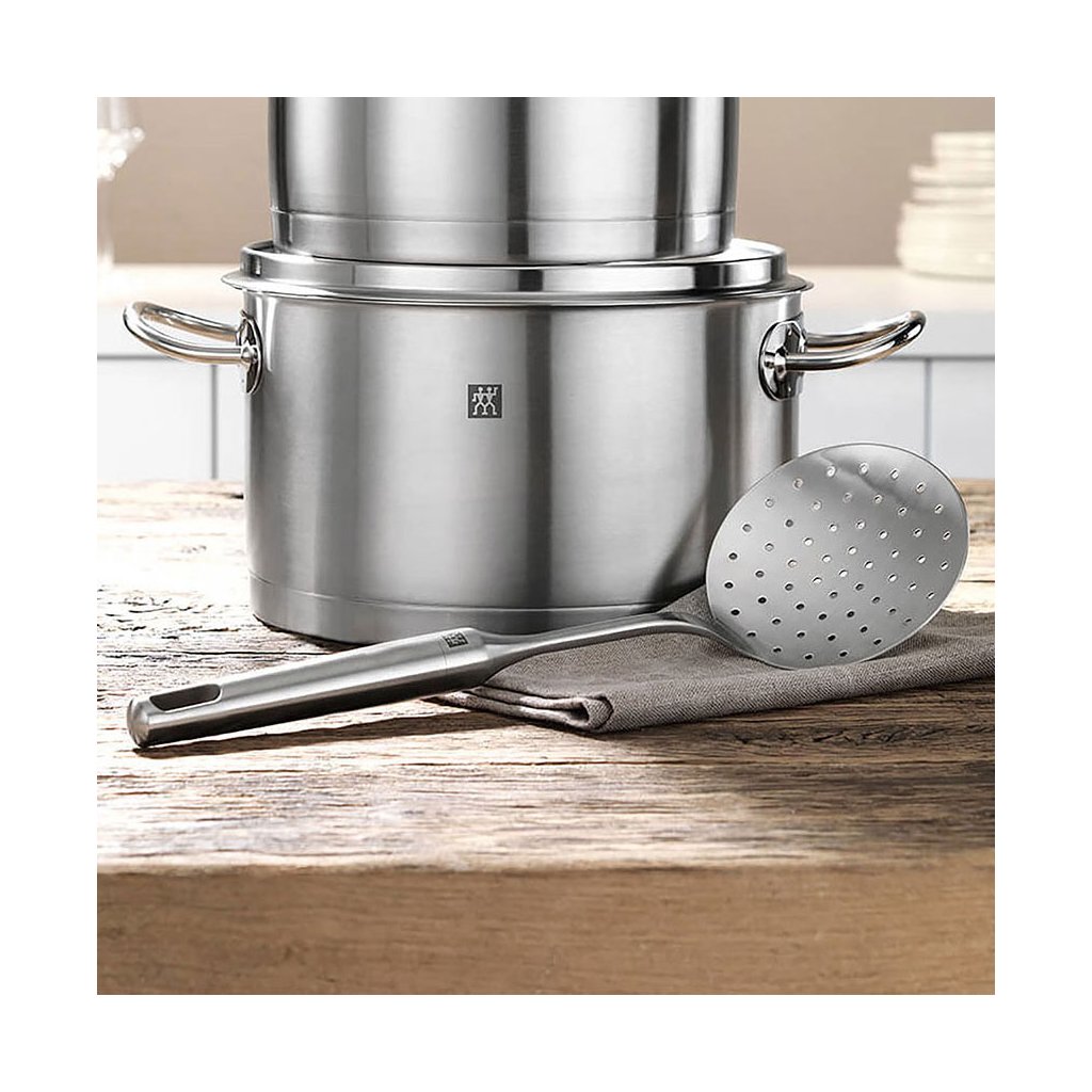 De opschuimer is geschikt voor het gemakkelijk verzamelen van schuim bij het koken van soepen of schuim gevormd op melk/saus. U kunt het ook gebruiken om knoedels uit heet water of gebakken voedsel uit kokende olie te halen. De licht gebogen vorm maakt het gemakkelijk om zelfs dicht bij de bodem drijvende stukken op te scheppen. Het ronde handvat ligt goed in de hand en is ook voorzien van een gat om op te hangen.