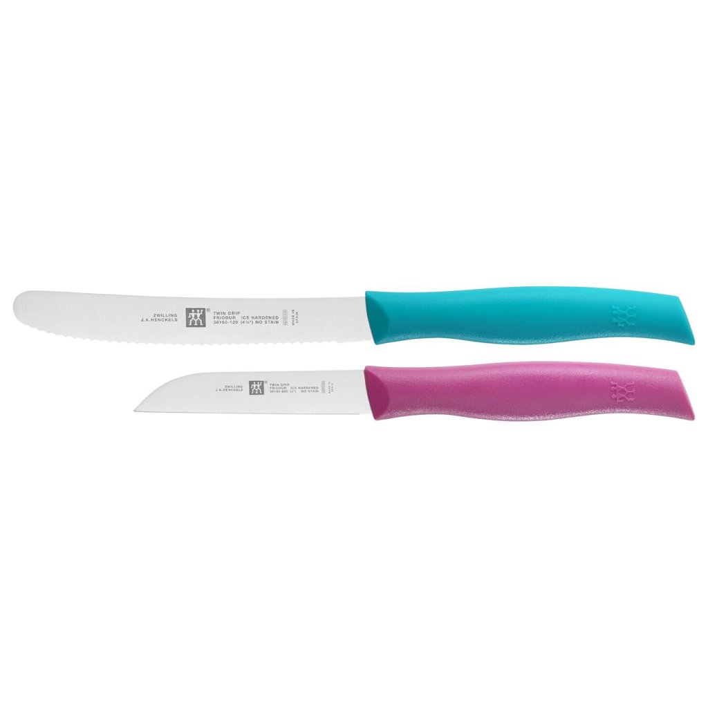 Het roze schilmes en het turquoise Zwilling TWIN Grip utility mes zullen onmisbare helpers zijn in uw keuken. De messen zijn gesmeed uit één stuk staal, dus geen lasnaden en geen verbindingen. Ze zijn perfect uitgebalanceerd en veilig en gemakkelijk om mee te werken. De messen zijn gevriesdroogd. Ze hebben een langdurige scherpte die gemakkelijk kan worden hersteld door handmatig slijpen, polijsten en lasercontrole.