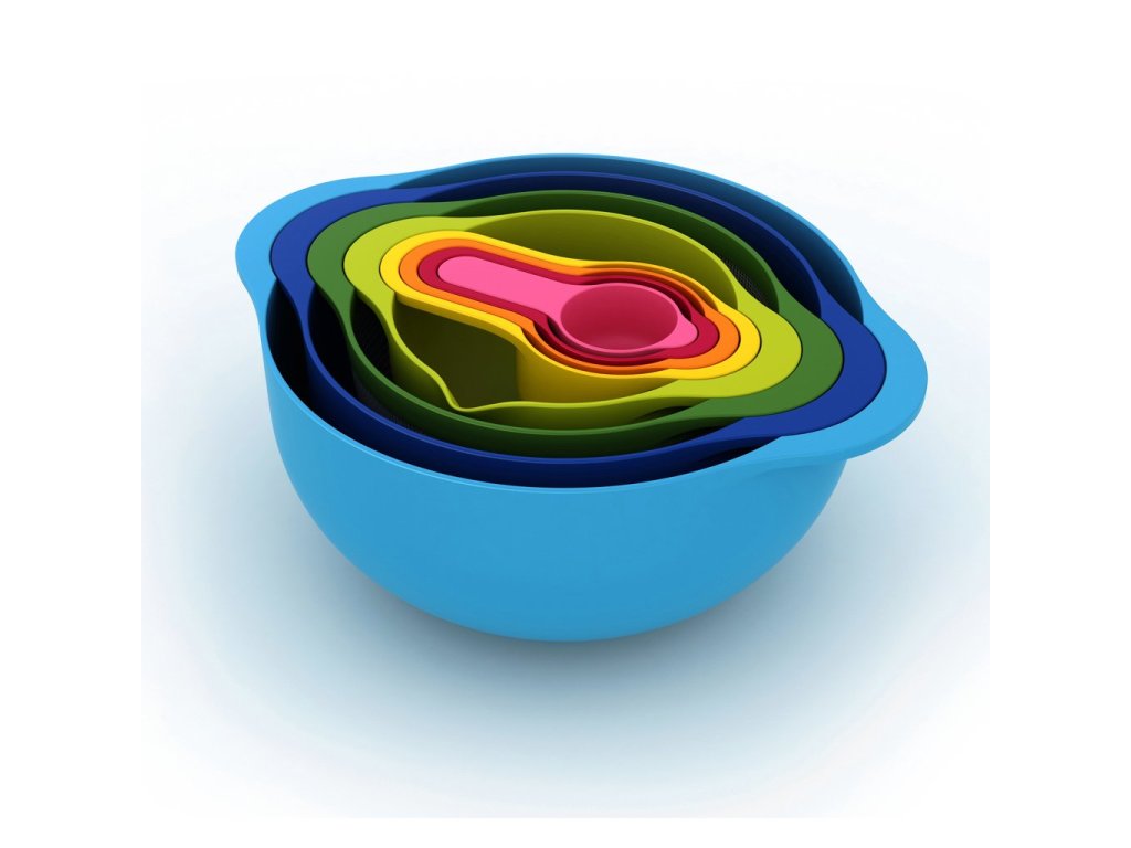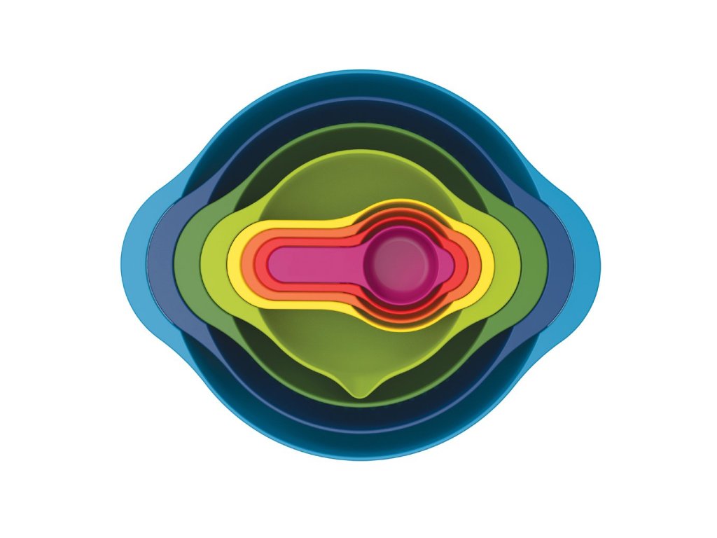 In deze handige Nest™ 8 set van Joseph Joseph vindt u een grote (4,5 l) en een kleine kom (1,65 l), een plastic vergiet (3 l), een kleine kom met interne maatgroeven (0,5 l) en vier maatbekers met handvat (250 / 125 / 85 / 60 ml). Alle kommen en maatbekers zijn stapelbaar, dus ze besparen ruimte in uw keuken. Alle kommen, vergieten en maatbekers hebben praktische handgrepen voor gemakkelijk hanteren en zijn gemaakt van veilig, BPA-vrij plastic.