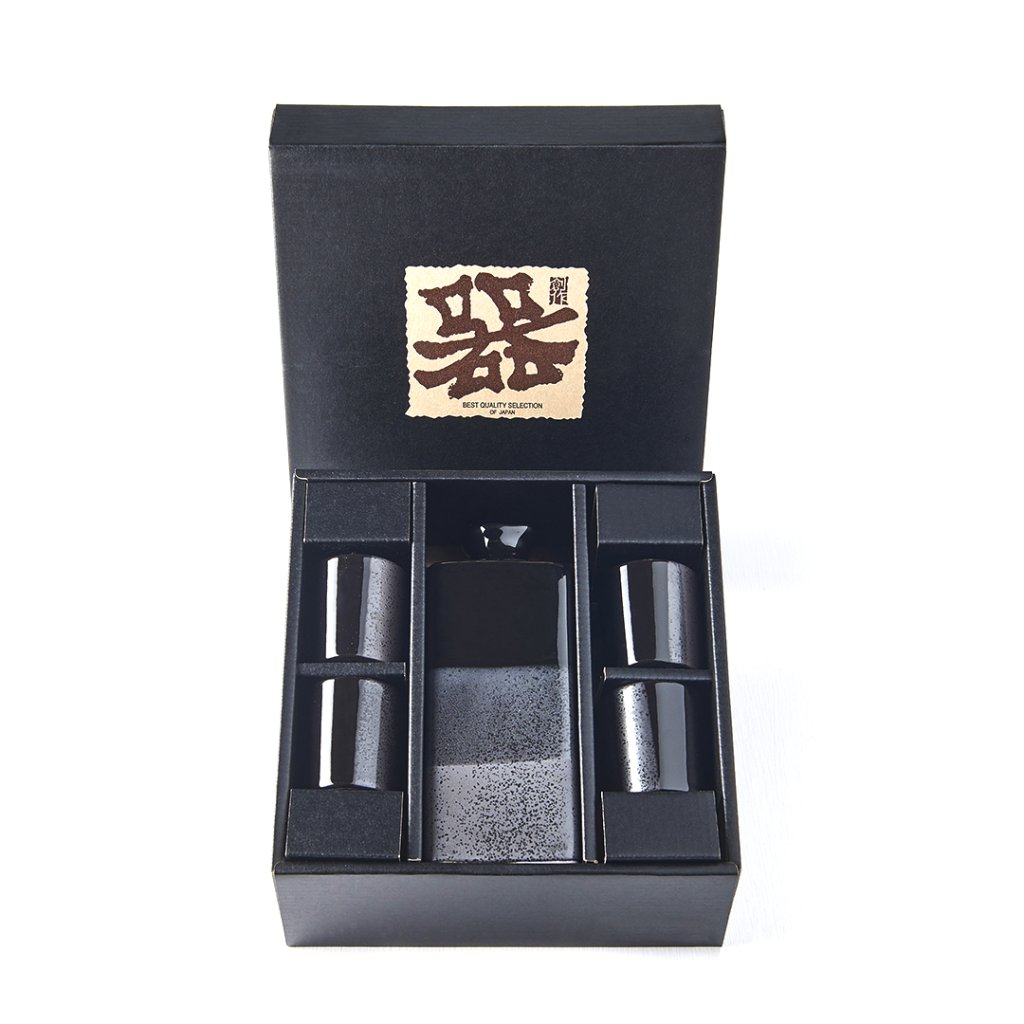 De sake set wordt geleverd in een zwarte geschenkdoos.