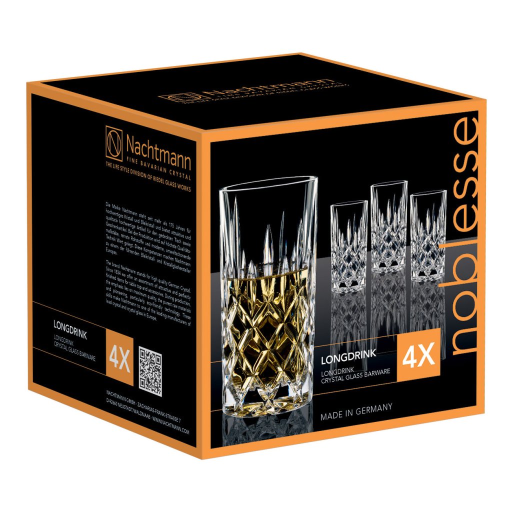 Set van 4 longdrinkglazen Noblesse van de Duitse fabrikant Nachtmann tilt uw genot van uw favoriete drankje naar een hoger niveau. Kristalglas versierd met geslepen decoratie in een klassieke herenstijl voegt een vleugje verfijnde elegantie toe aan elke stijl van inrichting.