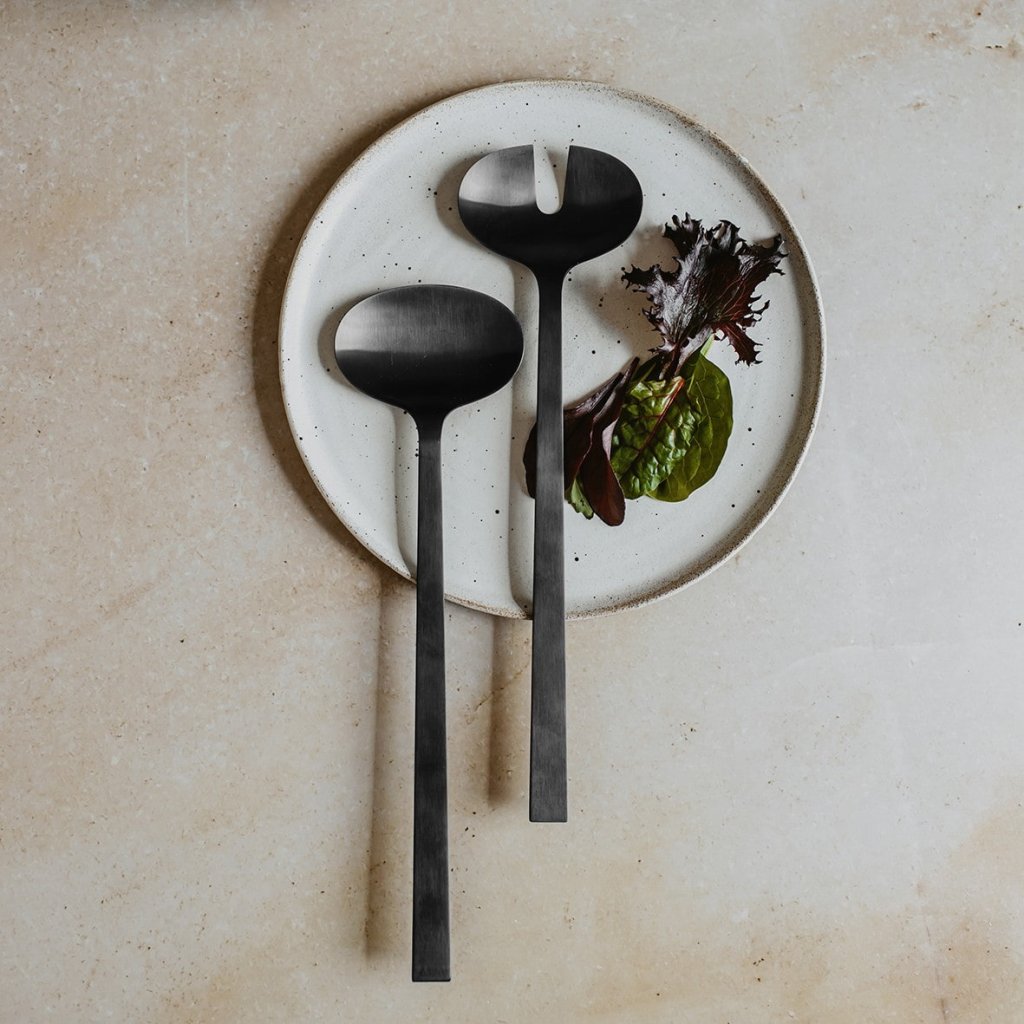 - slalepels LENORA in het zwart en 30 cm lang is een elegante set van twee stuks, ontworpen voor het serveren en portioneren van salades
