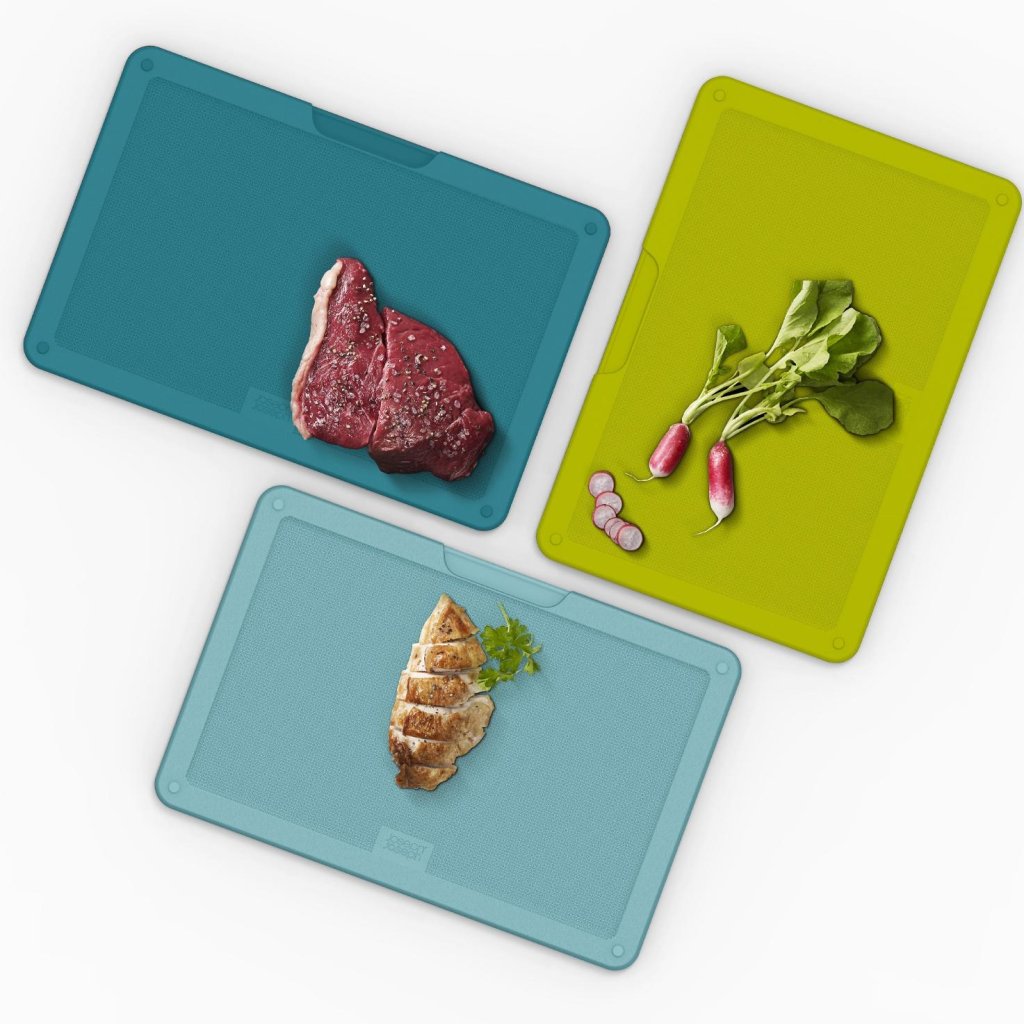 - Drie kleurgecodeerde snijplanken maken het mogelijk om het snijden van vlees, groenten en kant-en-klare gerechten overzichtelijk te scheiden en bevorderen veiliger koken zonder onnodige compromissen.