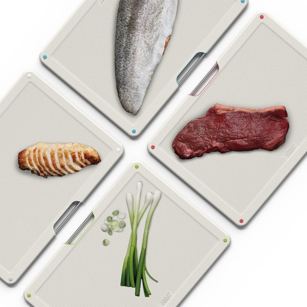 - Elke snijplank is kleurgecodeerd, zodat je tijdens het koken gemakkelijk de juiste snijplank voor een specifiek type ingrediënt kunt kiezen en de bereiding van maaltijden beter kunt organiseren.