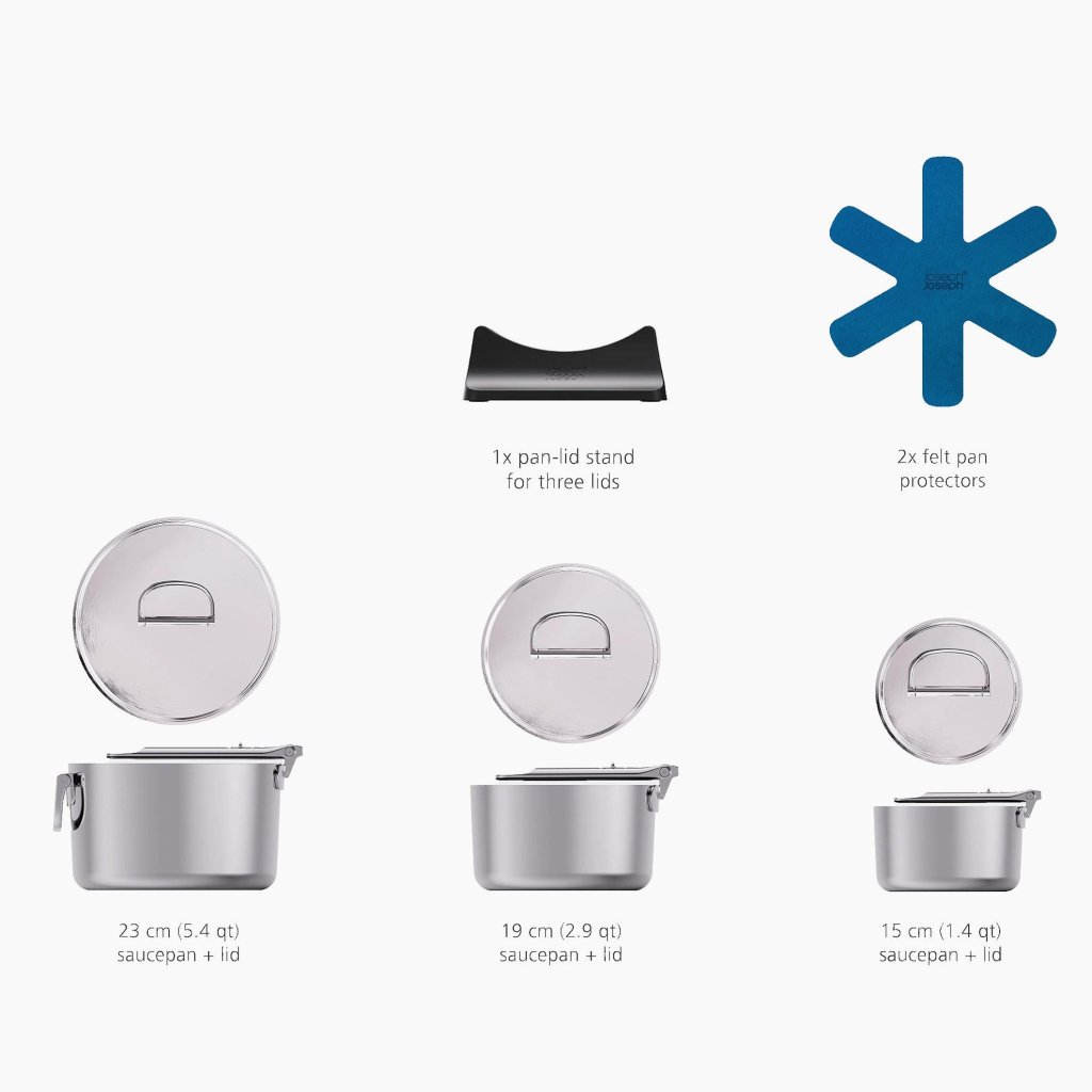 - De set bevat 3 steelpannen met een diameter van 15 cm, 19 cm en 23 cm, elk met een eigen roestvrijstalen deksel voor comfortabel en efficiënt koken.