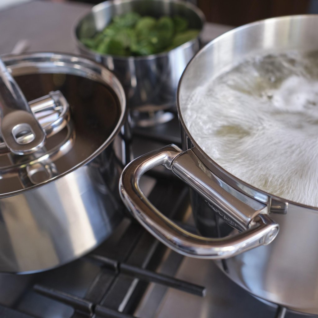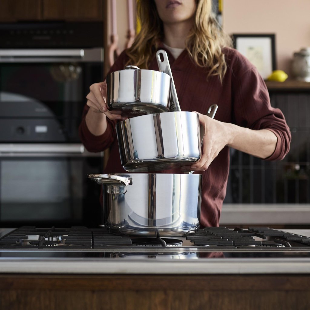 - De robuuste drielaagse constructie combineert een gepolijst roestvrijstalen buitenkant, een aluminium kern voor gelijkmatige warmteverdeling en een roestvrijstalen binnenlaag.