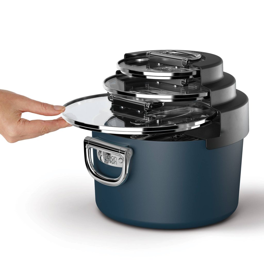 - Het pakket bevat een standaard voor drie deksel, die op de pannen geplaatst kunnen worden, zodat ze netjes en compact in het keukenkastje opgeborgen kunnen worden.