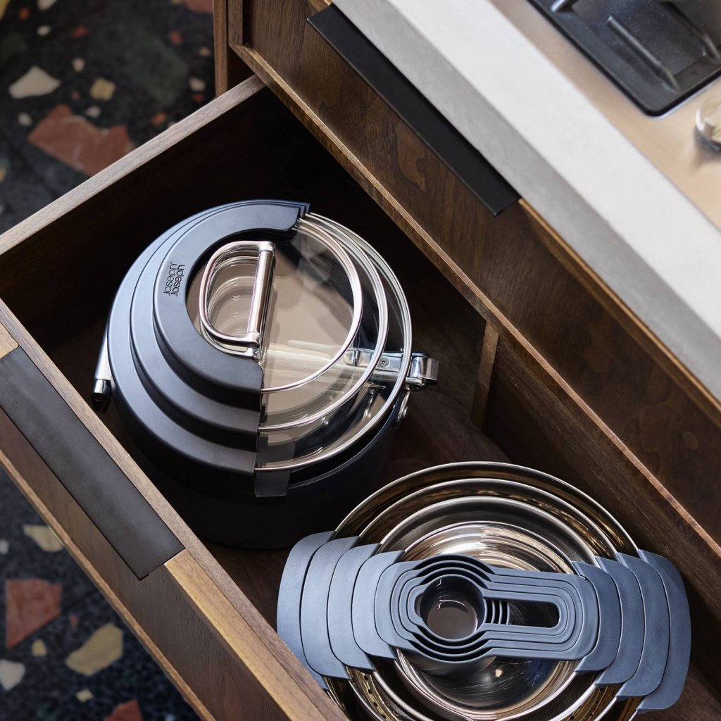 Kookgerei dat de realiteit van de moderne keuken begrijpt - Joseph Joseph SPACE. Tijdens het koken staat hij stevig en zeker, klaar om alles aan te kunnen, van een snel ontbijt tot een geĂŻmproviseerd diner. Maar als het tijd is om op te ruimen, verandert hij van karakter en past hij zich onopvallend aan de ruimte aan, zonder meer ruimte in te nemen dan strikt noodzakelijk. Wat wil je nog meer?