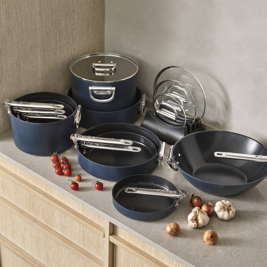 Kookgerei dat de realiteit van de moderne keuken begrijpt - Joseph Joseph SPACE. Tijdens het koken staat hij stevig en zeker, klaar om alles aan te kunnen, van een snel ontbijt tot een geïmproviseerd diner. Maar als het tijd is om op te ruimen, verandert hij van karakter en past hij zich onopvallend aan de ruimte aan, zonder meer ruimte in te nemen dan strikt noodzakelijk. Wat wil je nog meer?