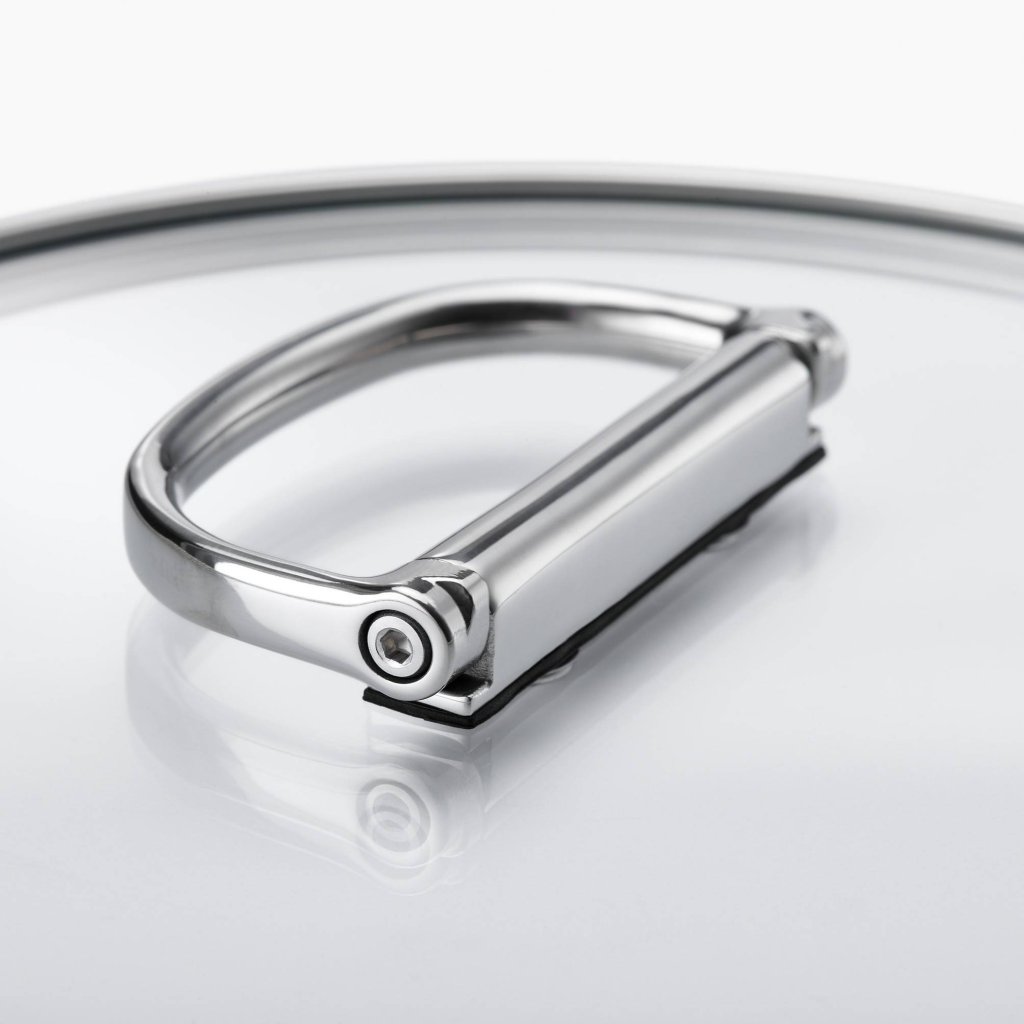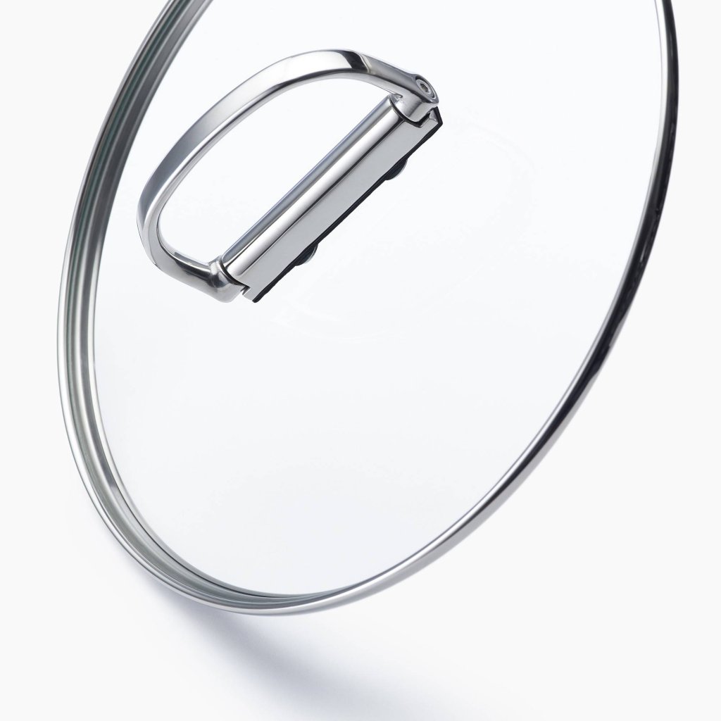 - Het omvat een deksel gehard glazen deksel met een roestvrijstalen rand en een inklapbaar roestvrijstalen handvat voor nog efficiëntere opbergmogelijkheden.