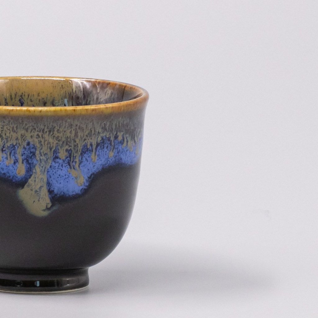 BLACK BRIGHT BLUE heeft een dramatisch contrast dat pas subtiel lijkt als er licht op valt. De blauwe druppels lijken op een donkere achtergrond een ijzige, goudkleurige tint, iets tussen saffierglank en inkt in. En het geheel creëert een sfeer waarin zelfs gewone thee opeens een ritueel lijkt en geen snelle redding na een zware dag.