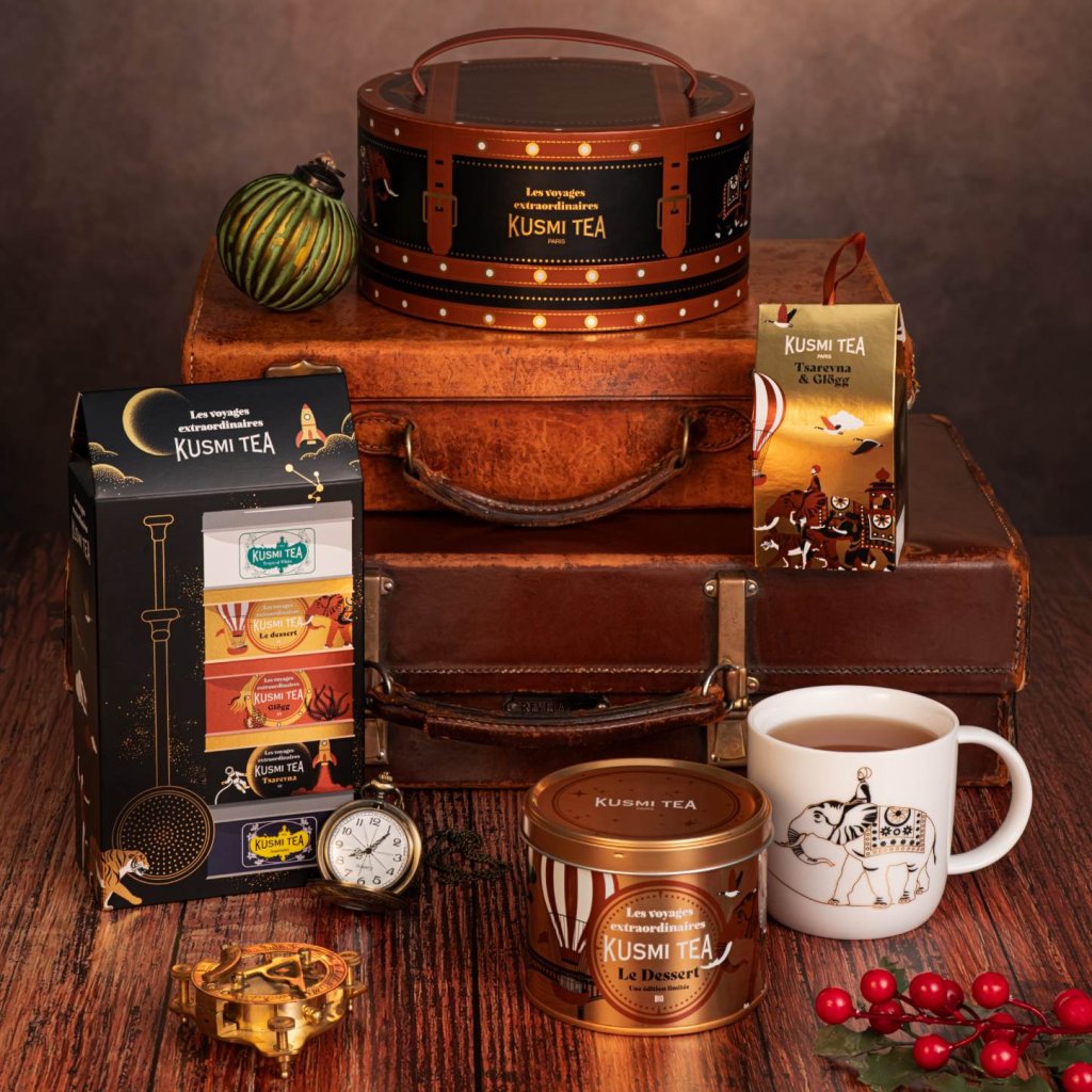 - Kerstcadeauset Kusmi Tea bevat twee theeminiaturen in een elegante geschenkdoos met een kerstmotief.