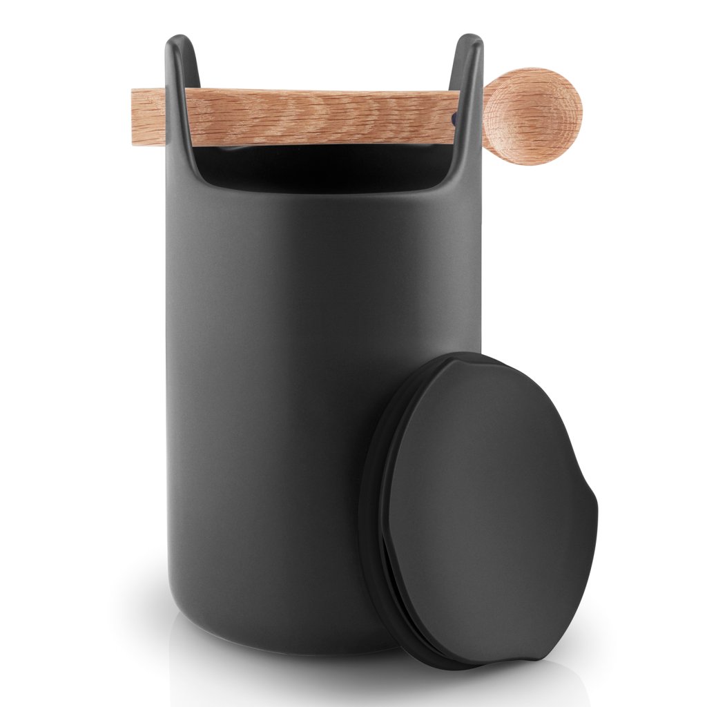De keramische multifunctionele voedselcontainer Eva Solo combineert een trendy zwarte kleur met een lepel van licht eikenhout, die het geheel een warme tint geeft en tevens als handvat dient. Het maakt gebruik van een eenvoudig, onderscheidend ontwerp met een hoge mate van functionaliteit. Bovendien is de container voorzien van een luchtdicht deksel.