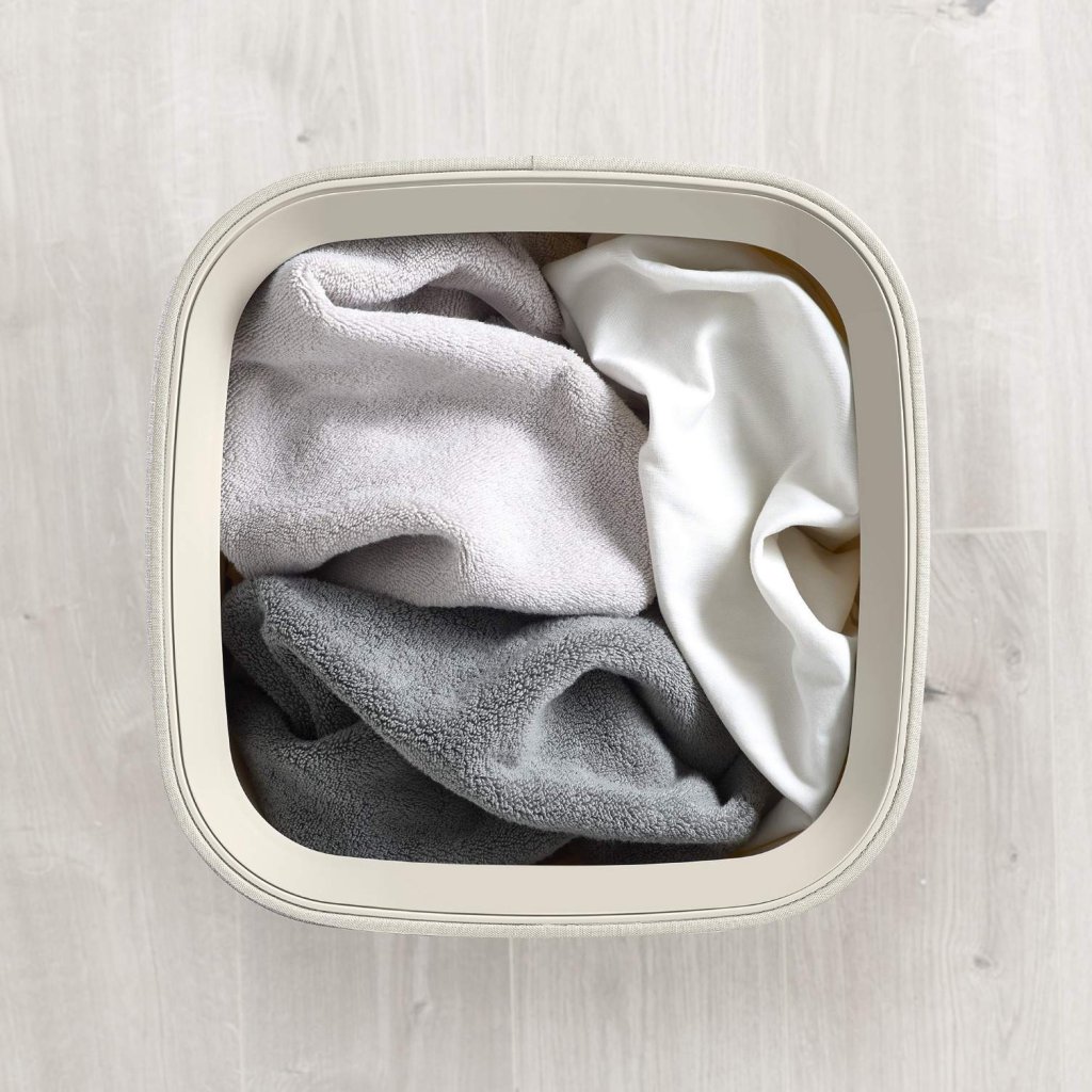 - De uitneembare textielen tas met stevige handvatten maakt het gemakkelijk om het wasgoed direct naar de wasmachine te dragen zonder de hele mand te hoeven hanteren.