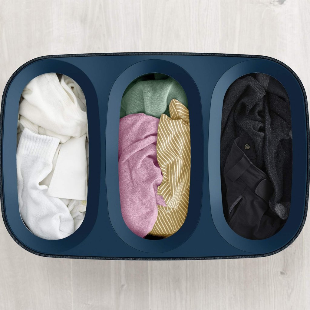 - Drie aparte compartimenten van 30 liter maken het gemakkelijk om licht, donker en gekleurd wasgoed al bij het opbergen te scheiden.