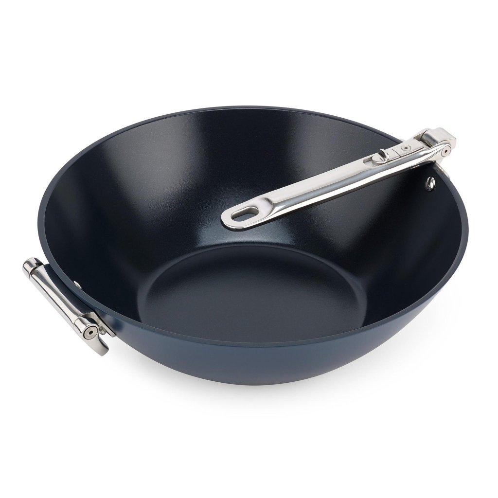 - Dankzij het inklapbare mechanisme kan het handvat eenvoudig langs het lichaam van de wok worden gevouwen, waardoor tot vijftig procent ruimte wordt bespaard in vergelijking met normaal kookgerei.
