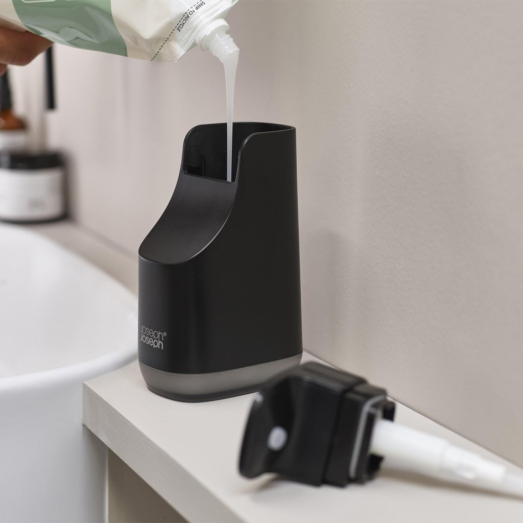 - Zeepdispenser Joseph Joseph SLIM in zwart is een elegante en ruimtebesparende oplossing voor dagelijkse hygiëne bij de keuken- en badkamerkraan.